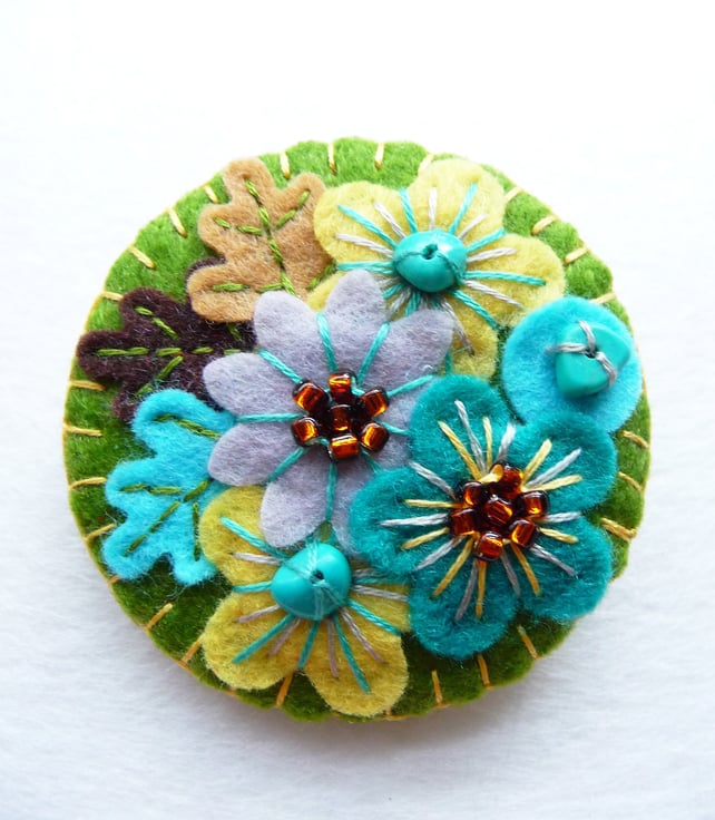 Japanese Art Inspired Free form Embroidery Handmade Mini Felt Brooch - Olive