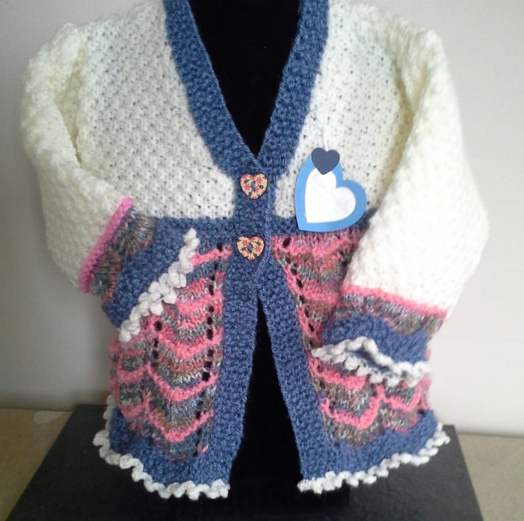 A very sweet eye catching v neck baby girl's cardigan lovingly designed and hand crafted by myself. What little one would not look adorable wearing it!
