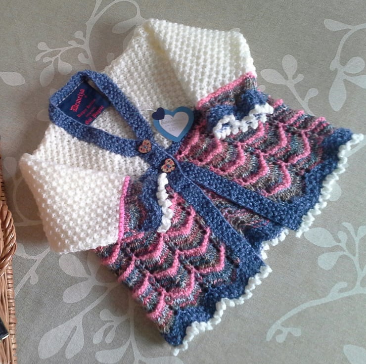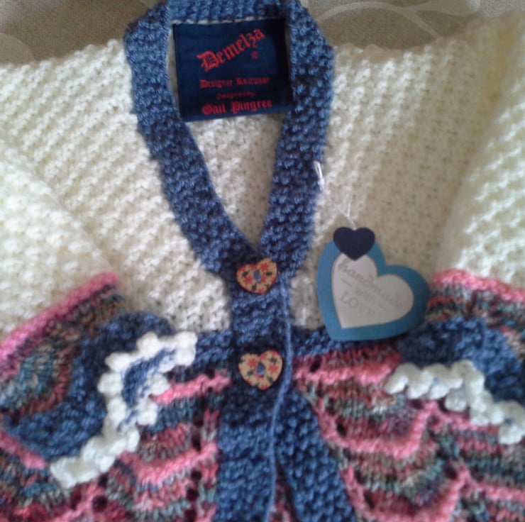 This garment would be an ideal next size up baby shower or new born baby girls gift. Quality designer hand knitted baby products are now in much demand by modern parents and when gifted are much appreciated as their baby will own and wear a unique baby product which has not been churned out by the thousands. In resent years acrylic knitting yarns have developed and are a lot more luxurious than in the past. I have used quality British branded machine washable yarns to achieve a quality item. The garment has two genuine wooden decorative buttons and hand crocheted delicate picot trims on the skirt and sleeve edges to give a soft feminine finish.