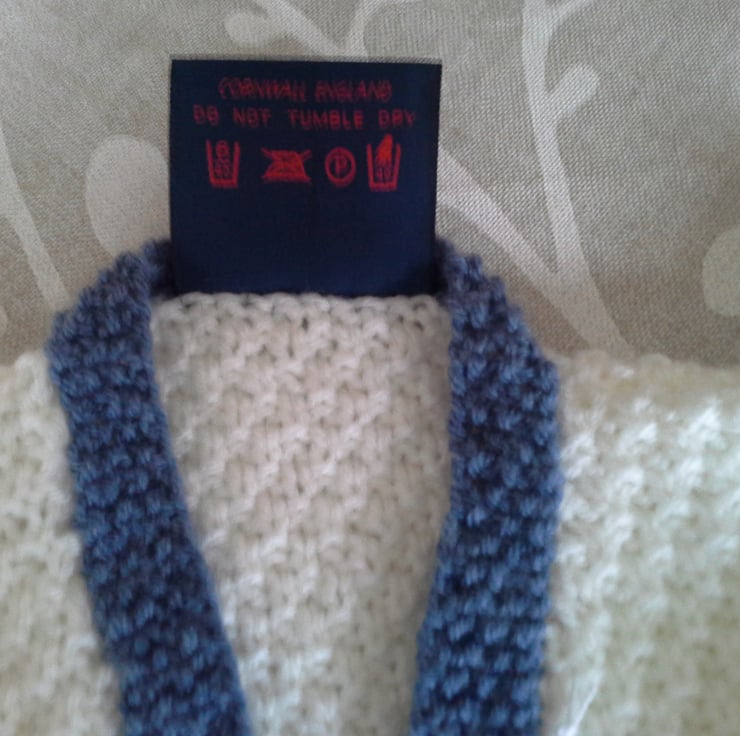 Baby knitwear is designed and hand crafted by Demelza Designs in Cornwall meeting UK baby safety standards, Only branded premuim acylic, acrylic/natural fibre blends or pure natural fibre yarns are used in baby knitwear which conforms to BS984/76 standards.