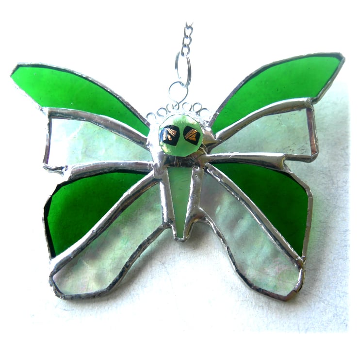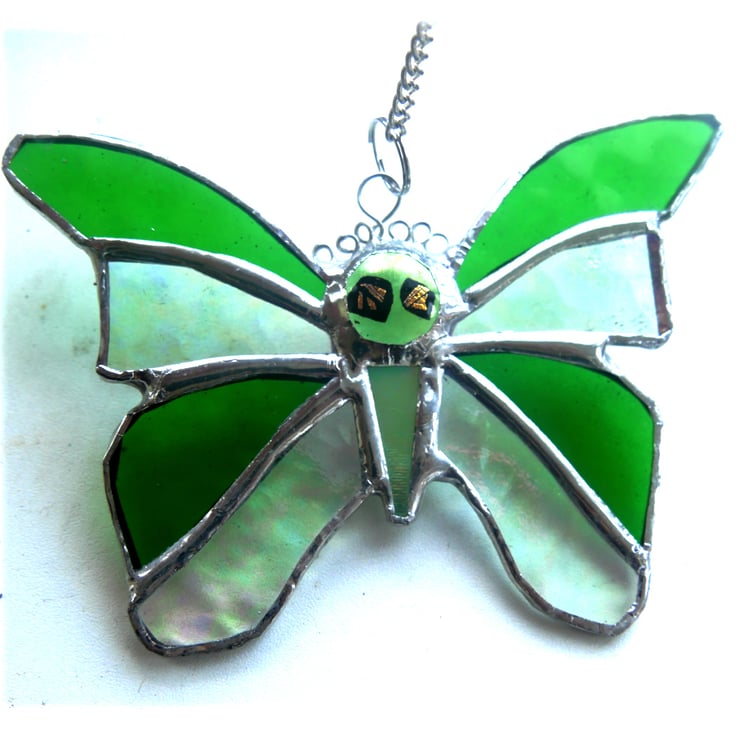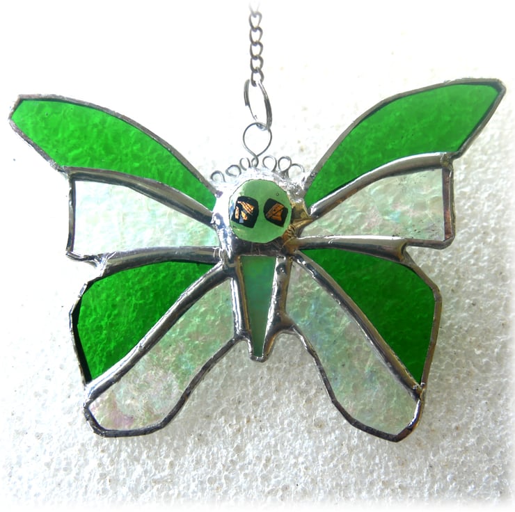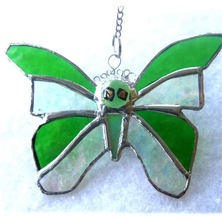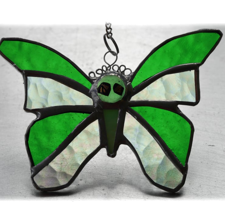 It is a butterfly made from Peridot green glass, Peridot being the UK birthstone colour for August. The other sections of the butterfly are clear, iridescent glass to give it even more shine.