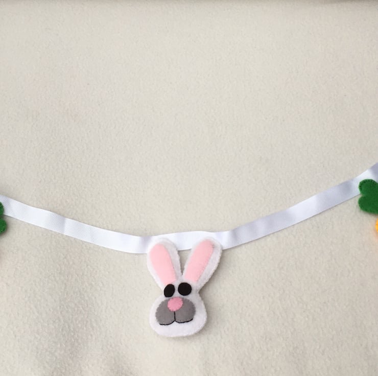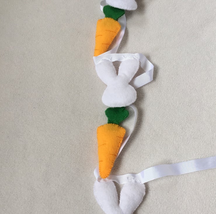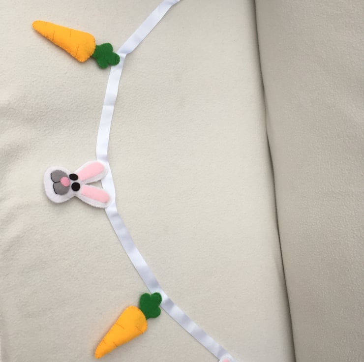 The garland displays the Rabbits and Carrots on 1.10cm (aprox) length of white ribbon. I have left 14 cm from the outer edge of first and last characters for hanging.