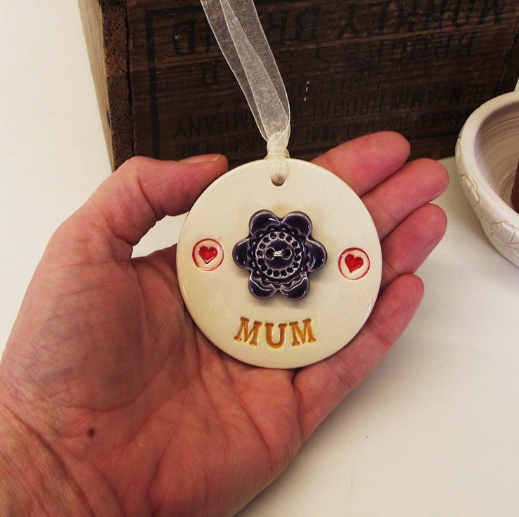 This cute little hanging decoration has been made from white earthenware clay where it has been decorated with colour and then fired twice.