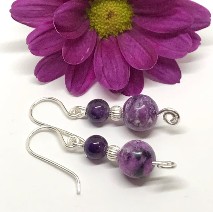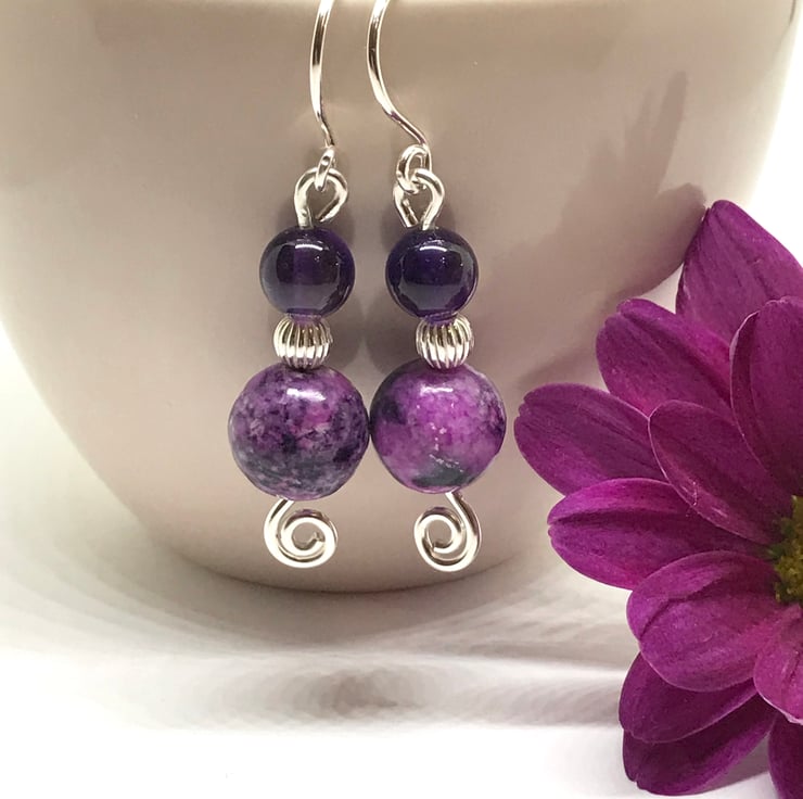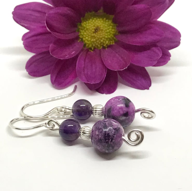 Sterling silver earrings with purple jasper and amethyst. A lovely gift for birthday, anniversary or other occasion.