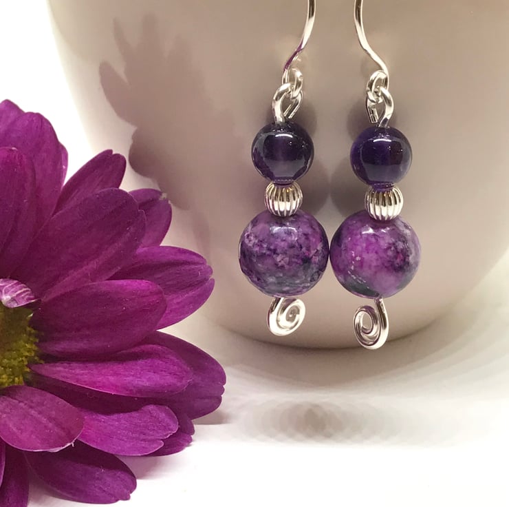 I have handcrafted these earrings with sterling silver using wire wrapping techniques. Beautiful purple jasper and dark purple amethyst beads have been added with a sterling silver ribbed bead and I have finished the earrings with a swirl detail. The ear hooks are also handcrafted with sterling silver.