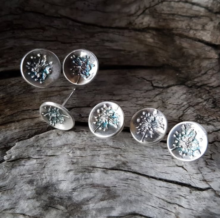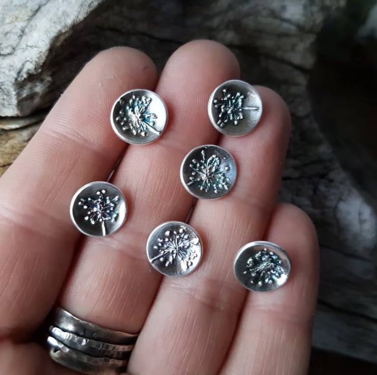 The disks measure approximately 10mm across and have a wee sprig of tiny flowers on them in a raised design, gently concave with a light patina to highlight their detail.