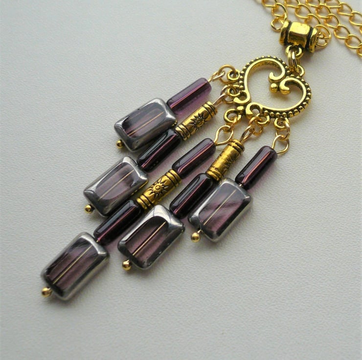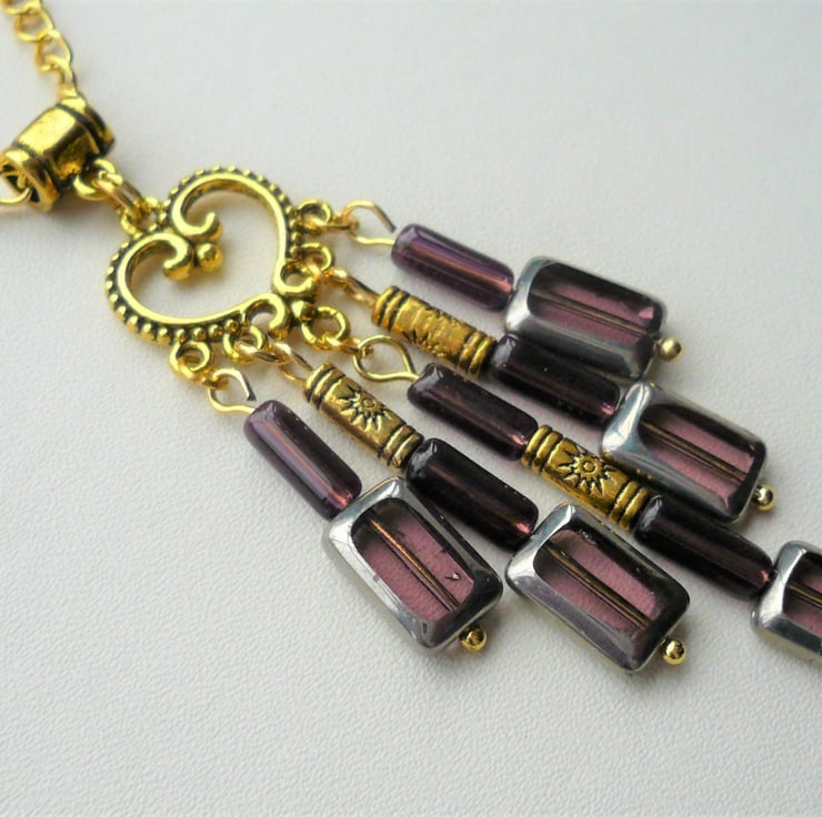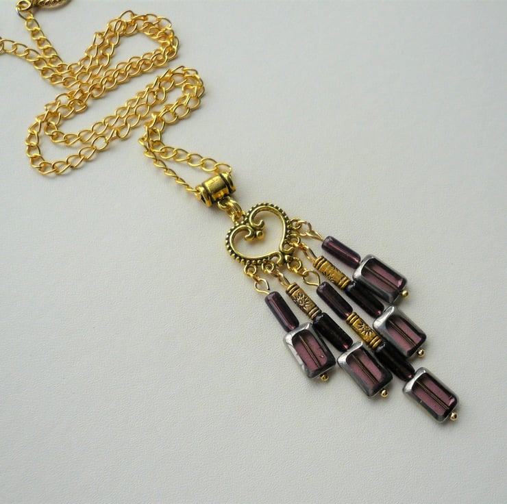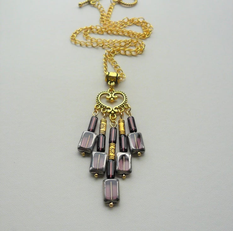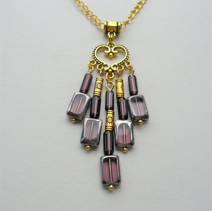 Pretty cluster necklace made up of electroplated glass oblong beads teamed with co-ordinating purple glass tubes and gold plated tube beads. These are all attached to a gold plated heart shaped connector and hung from a gold plated pendant bail and chain with toggle clasp to finish. Length including clasp is approx 45cm.