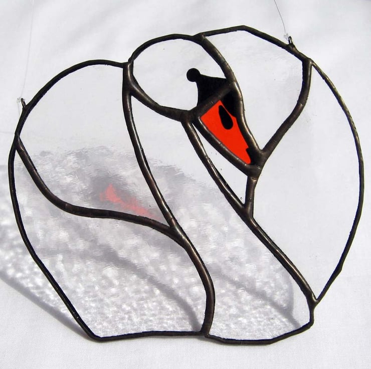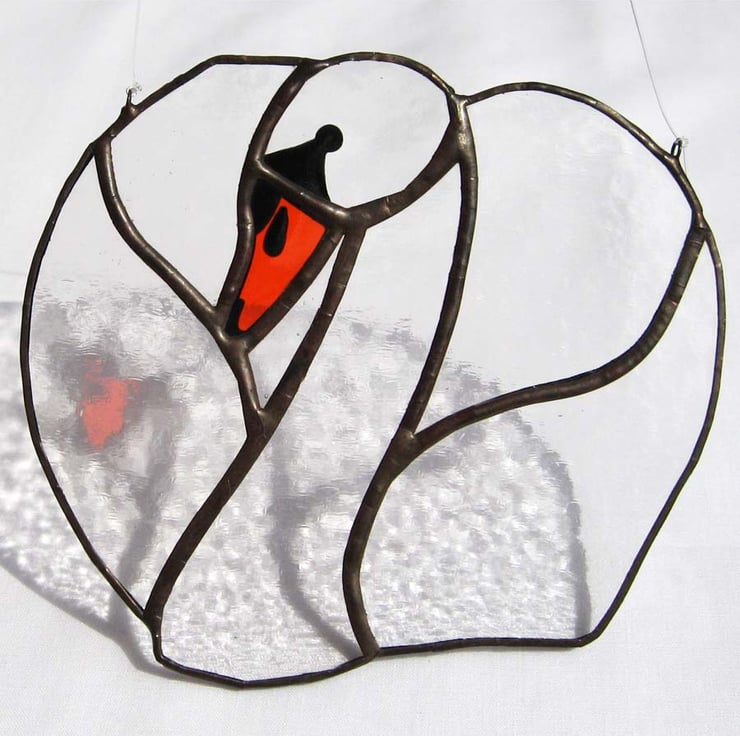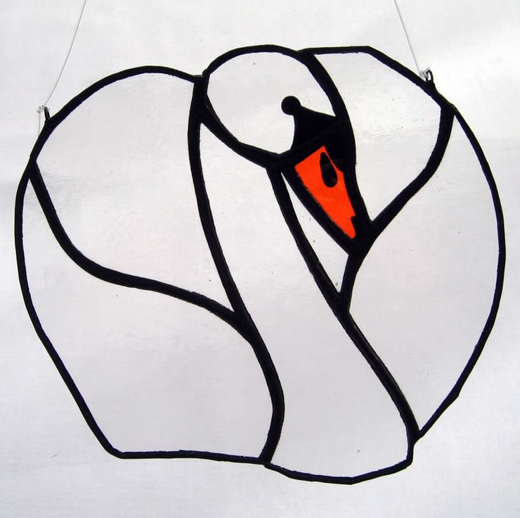 The swan has been created using the copper foil technique. The detail in the face and beak is hand painted and kiln fired making the markings permanent and enduring. Held by a length of strong, clear nylon line, it is ready to hang in a window or in front of any light surface.