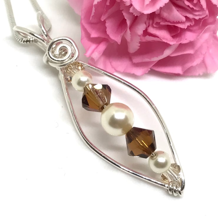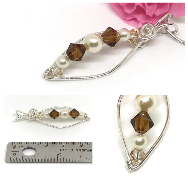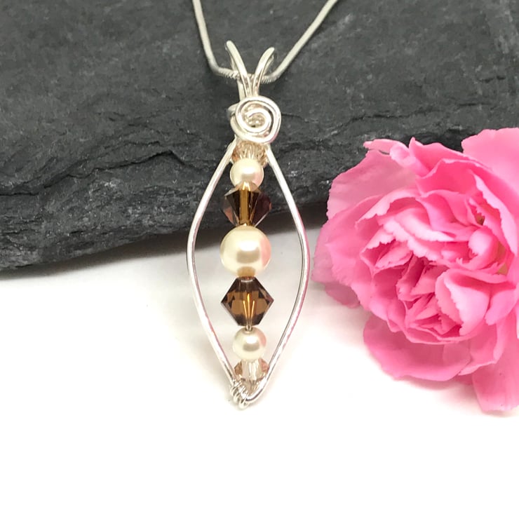 I have shaped sterling silver wire into a diamond shape and added cream glass pearls, dark topaz and golden shadow crystals with a beautiful sparkle.