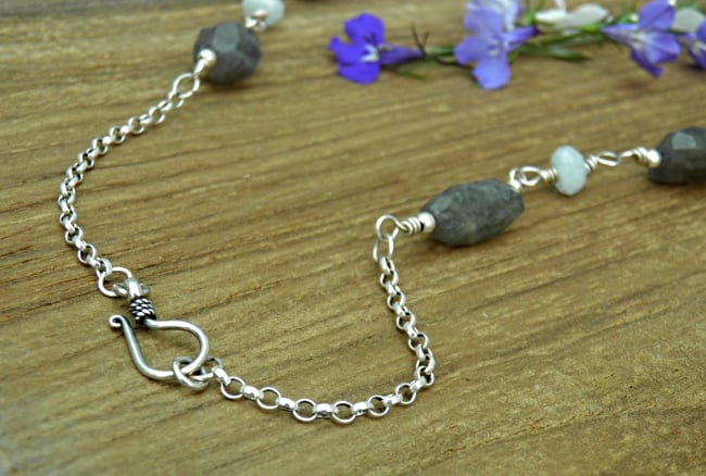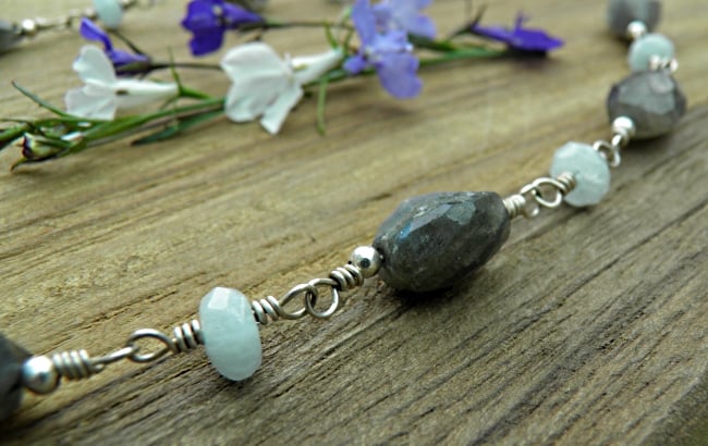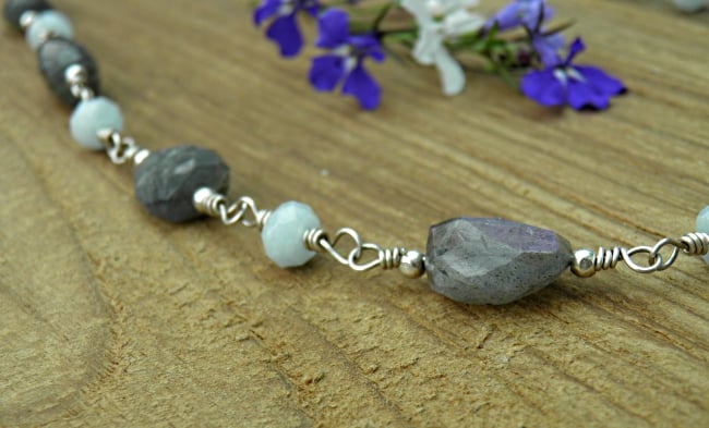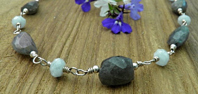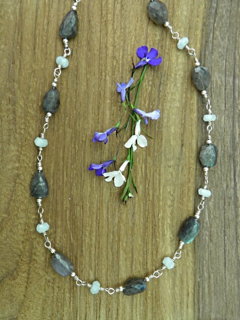 Beautiful faceted aquamarine and labradorite, sterling silver beads and handcrafted sterling silver links, complete with a sterling silver belcher chain and hook clasp.