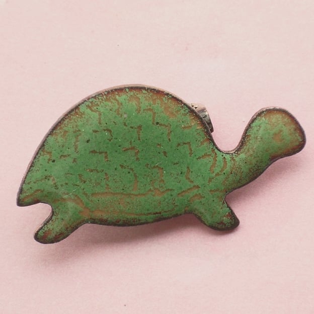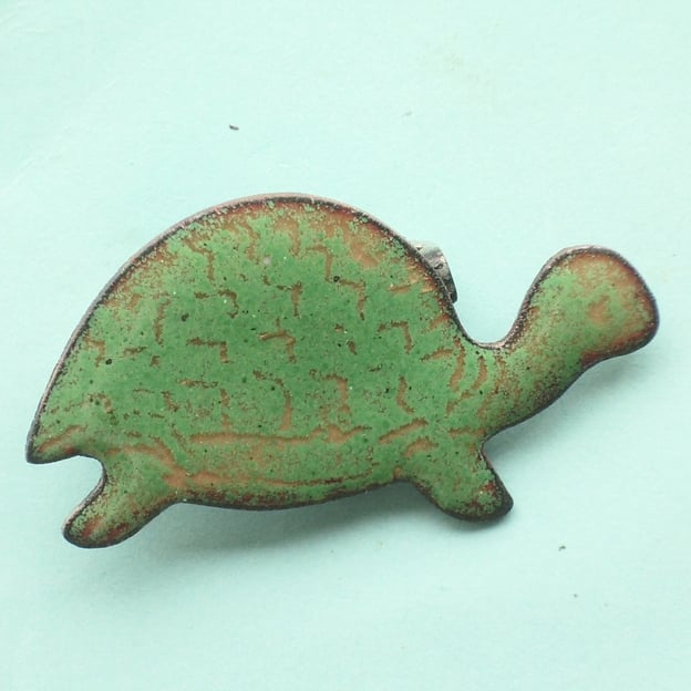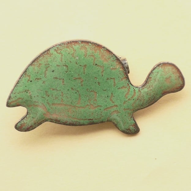 This tortoise measures 35mm by 20mm. It is mounted on a 20mm brooch bar, soldered to the copper base.