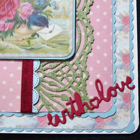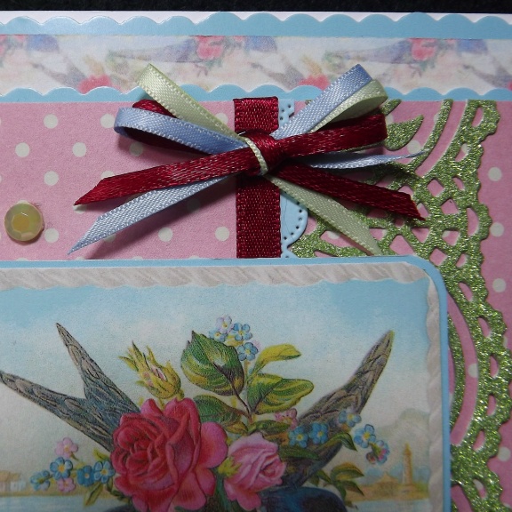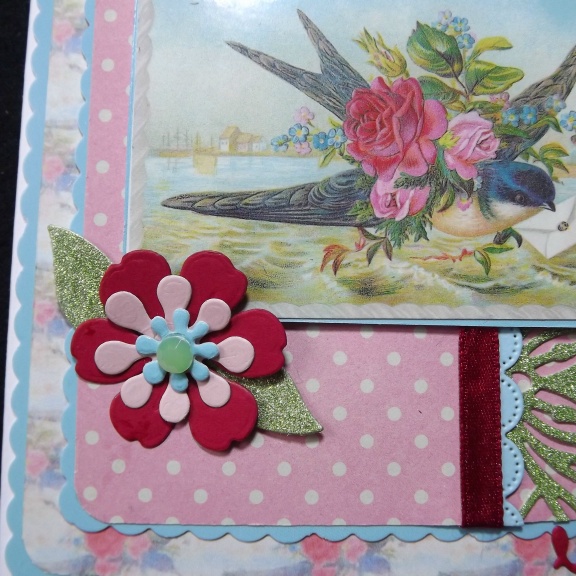 Featuring a picture of a swallow messenger on layers of patterned paper, blue card and a white card base, embellished with a pretty die cut border, flowers, ribbon & gems.