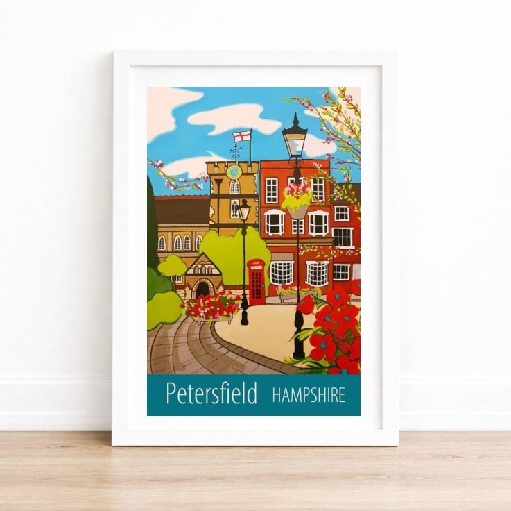 A contemporary travel poster style print of the square in Petersfield, Hampshire, from my own original acrylic painting. A perfect gift for those who love Petersfield!