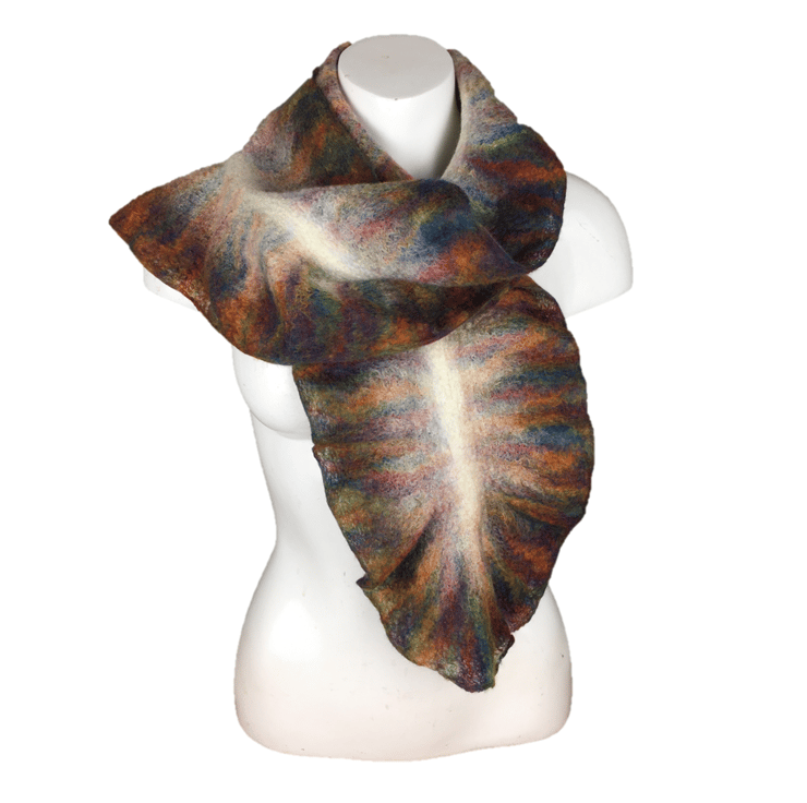 This beautiful and striking scarf has been wet felted using soft merino wool fibres. It has a white central band and a border in a rainbow of colours which has been laid out and manipulated to create a lovely structured ruffle effect. Included in Seconds Sunday as a clearance/end of line item.