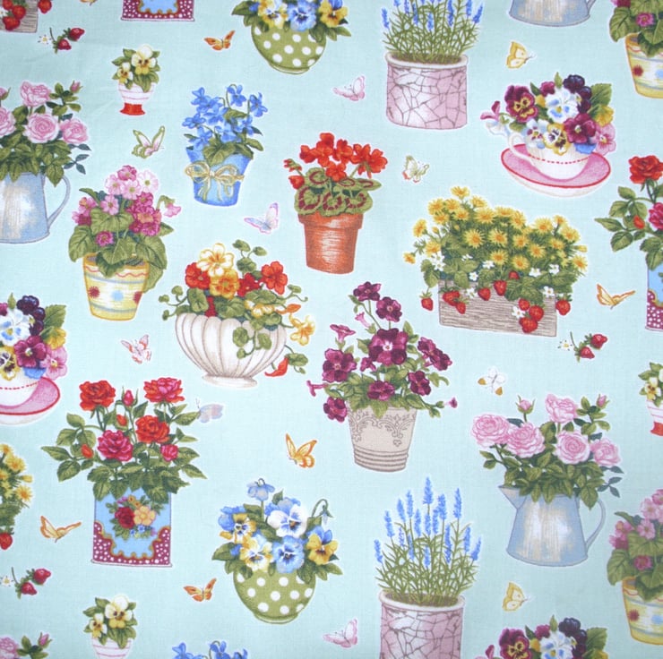 Pretty flowering plants in pots, jugs,tea cups, egg cups and baskets cloth shopping bag . very comfortable to carry with fabric handles , fully lined with cotton fabric, ideal for carrying shopping .also useful as an overnight bag for all those essential items or as hand luggage when travelling , will hold for example : a wash bag , make up bag , a book . it measures approx 33cm x 40cm .