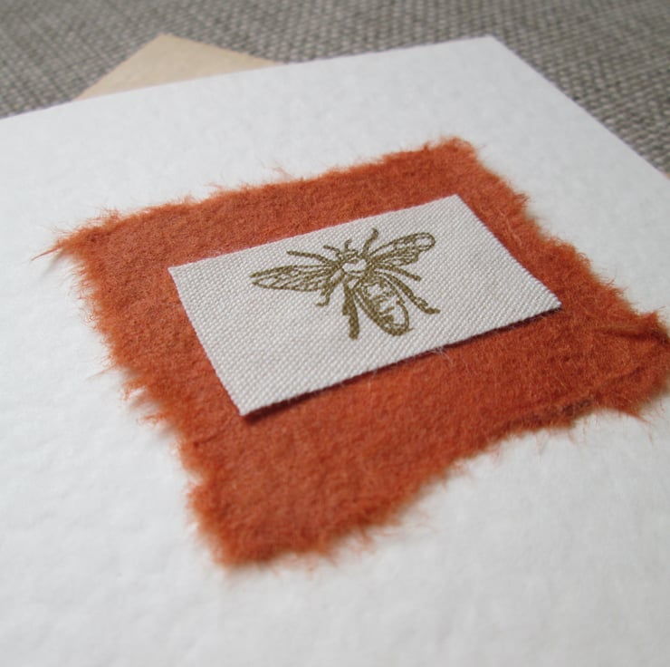 A lovely card with a fabric bee in a dark gold colour, on a piece of rust-coloured mulberry paper. The card is ivory with a lovely 'hammered' texture and A6 in size with a coordinating envelope, packaged in a cellophane wrapper.