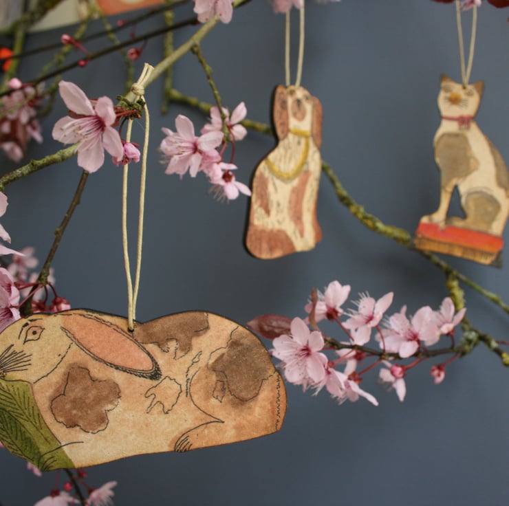 This very Rabbit crunching on is greens takes inspiration from Staffordshire Flat Back figurines. This hanging, along with my others are all designed and printed by myself using my own illustrations. It measures 9.1(w) x 4.9(h)cm and is made from MDF. Please do not reproduce any part of them.