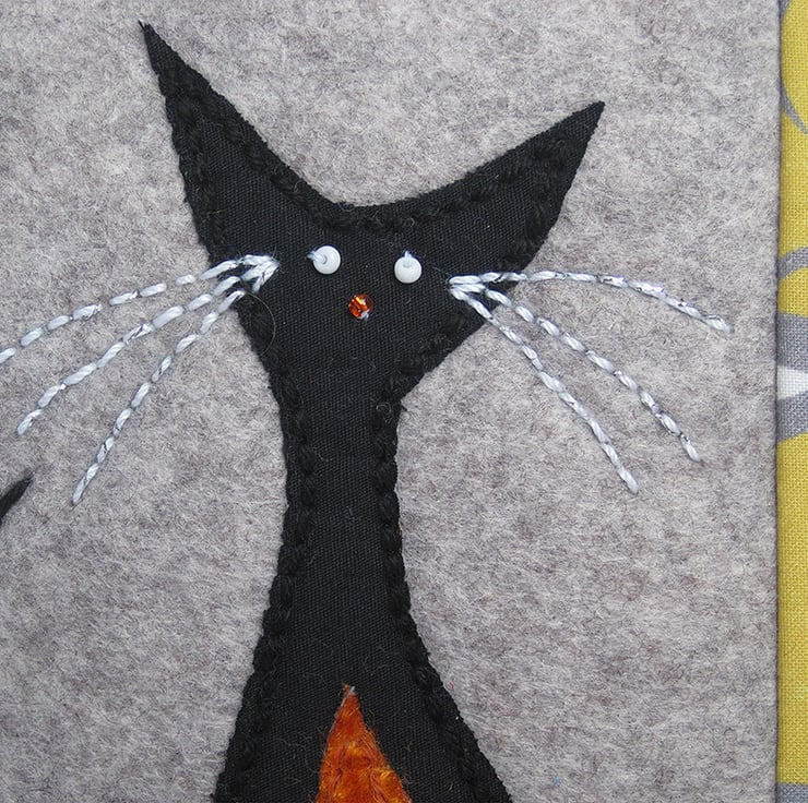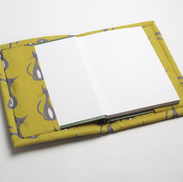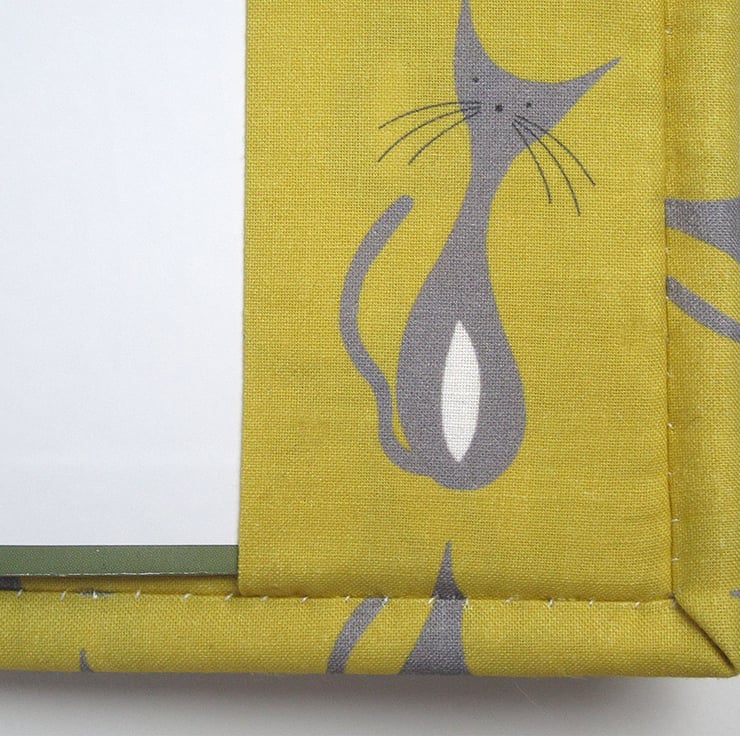 This A6 notebook cover is made in grey wool felt fabric and has a hand appliquéd cat on the front. The edge and the inside are trimmed with my own mid-century cat print on yellow/mustard background. The notebook tucks inside the jacket so you can replace the notebook once it is used up. The item comes supplied with a lined A6 notebook.