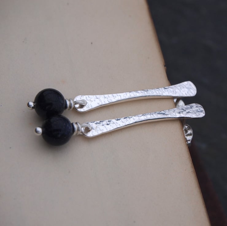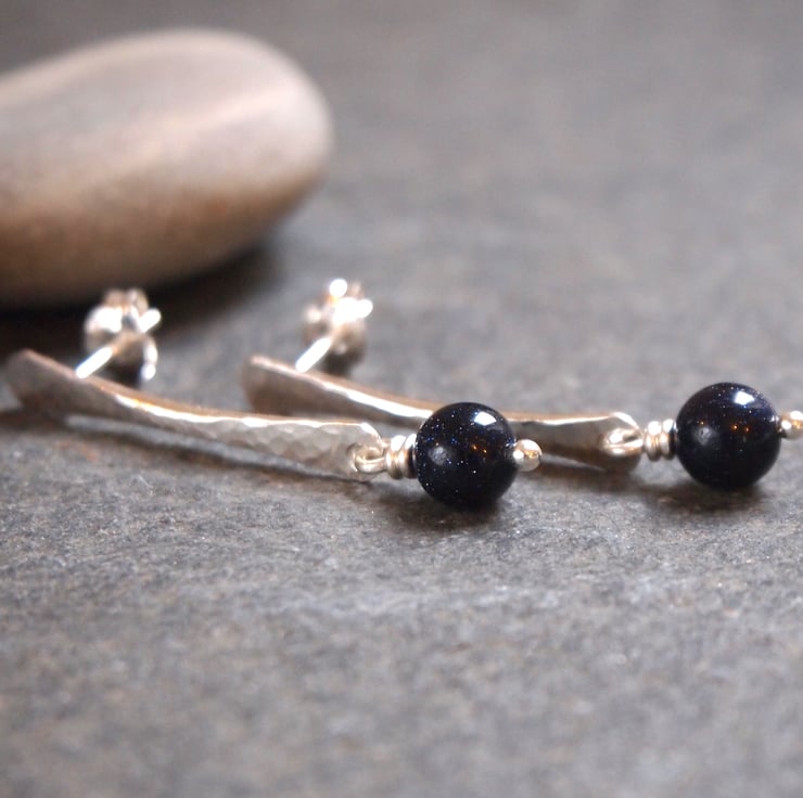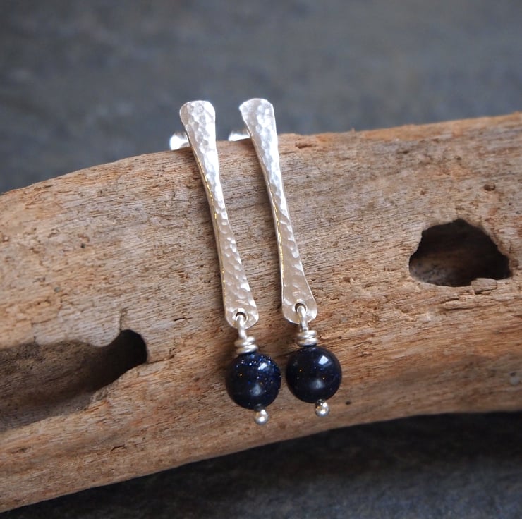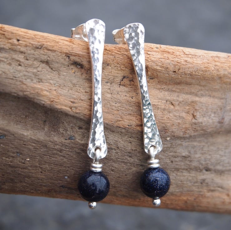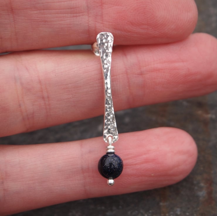 These stud earrings have been hand forged from rods of sterling silver. The surface of the silver has been hammered to give a lovely sparkly texture. For a bit more sparkle I added a blue goldstone bead that hangs by a twist of silver wire from the bottom of each earring.