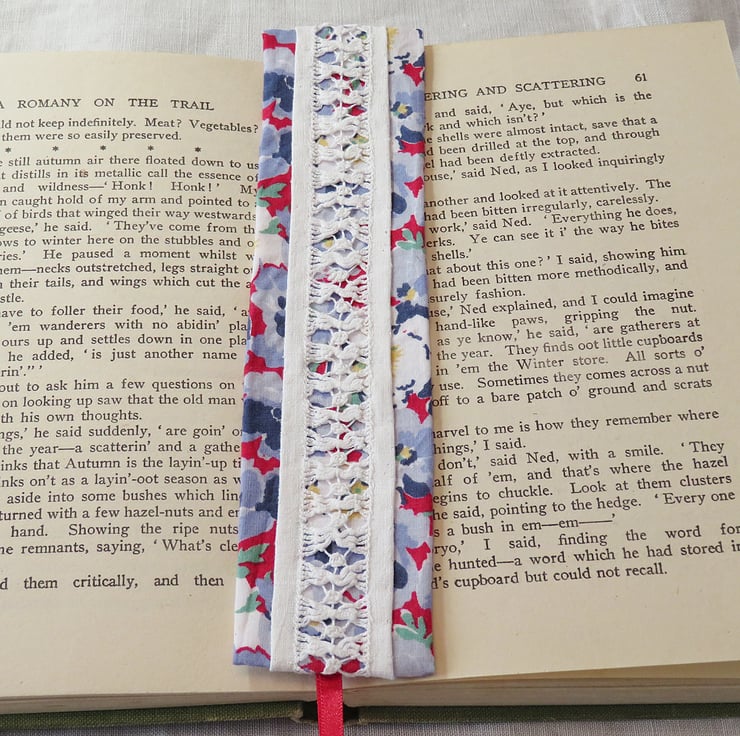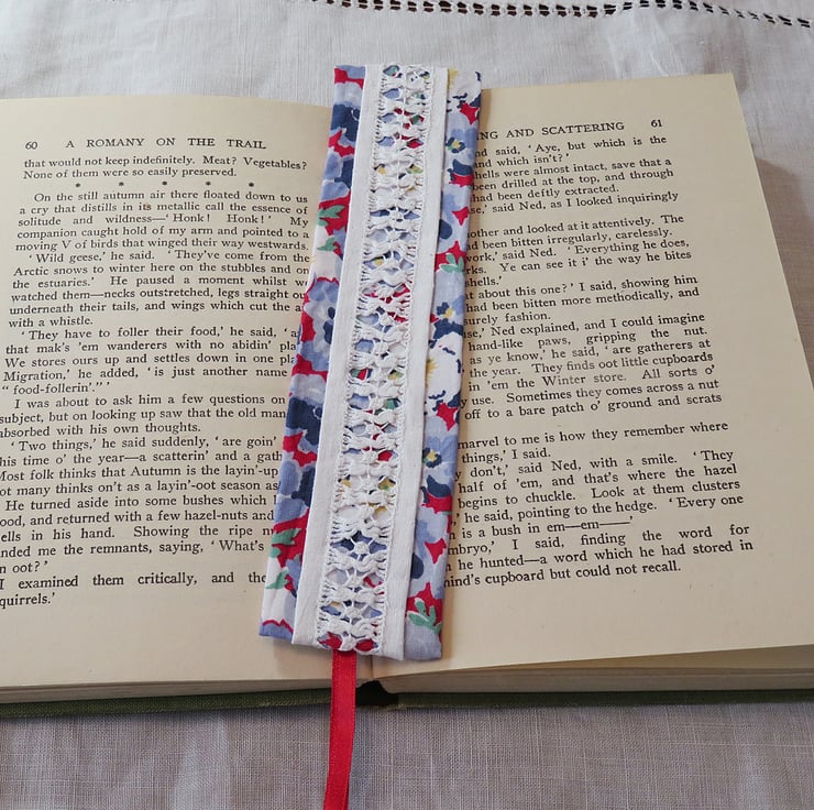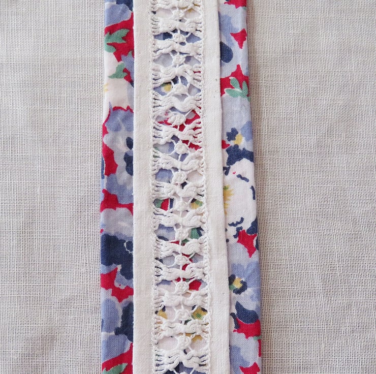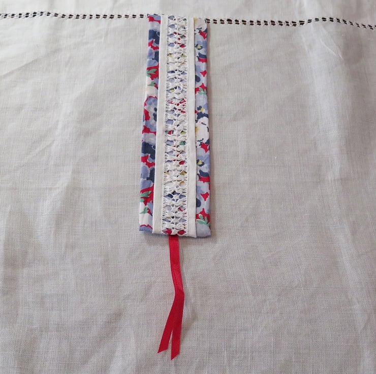 A beautiful portion of hand-stitched, drawn thread lace has been reclaimed from a vintage tablecloth and combined with a lovely blue, red and white, vintage Laura Ashley fabric to create this pretty bookmark. Ribbon tails complete the design. The bookmark is backed with fusible interfacing - slip-stitched in place for extra durability.