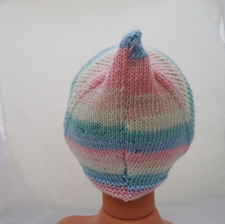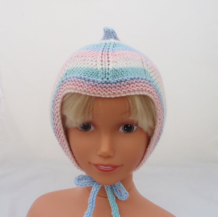 This baby bonnet is made with acrylic yarn.