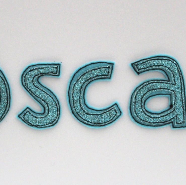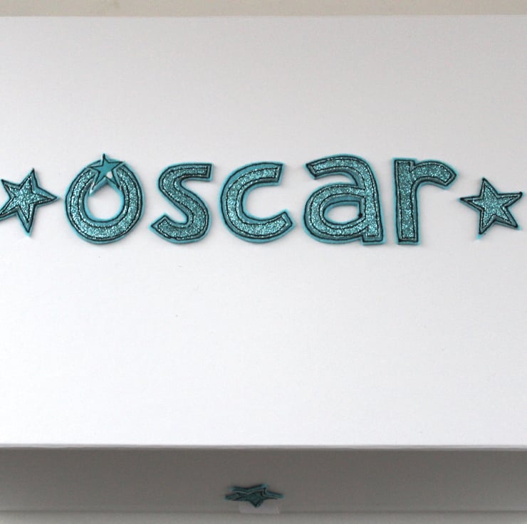 Personalise the box lid with your chosen name, created from a double layer of 100% wool felt and glitter cloth, sewn together and then cut away by hand and a very sharp pair of scissors.