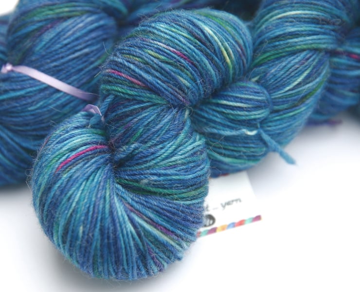 Blues with hints of green, pink and purple. This is a delightlfully soft and squashy superwash merino, alpaca and nylon blend in a 4-ply weight. It is very soft with a characteristic alpaca 'halo.' There is one skein left - it is the skein at the rear of the photos. Photos have been taken and edited in bright natural light.