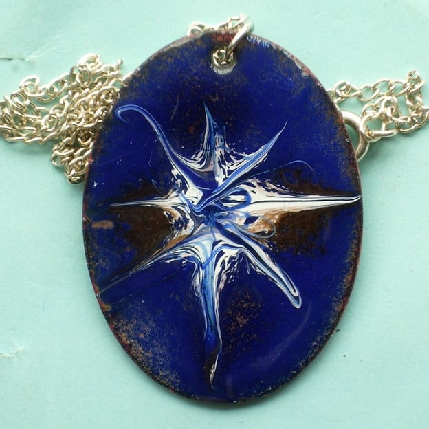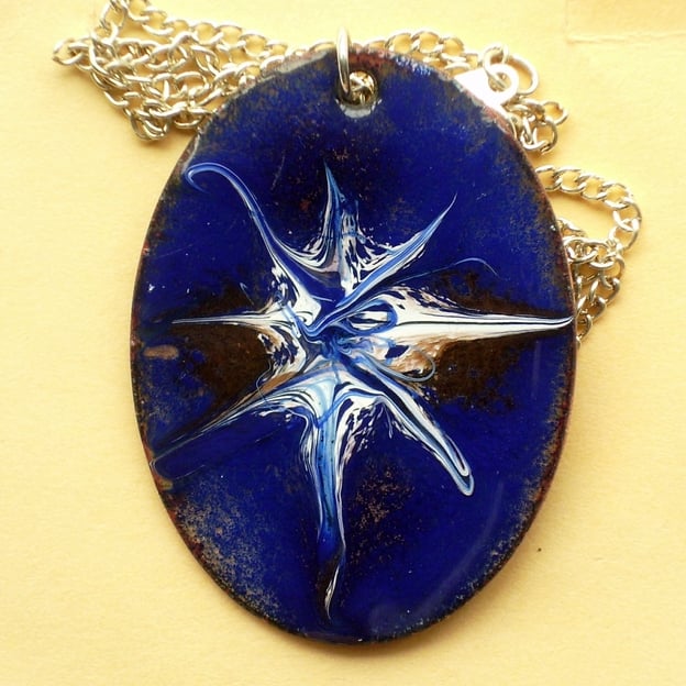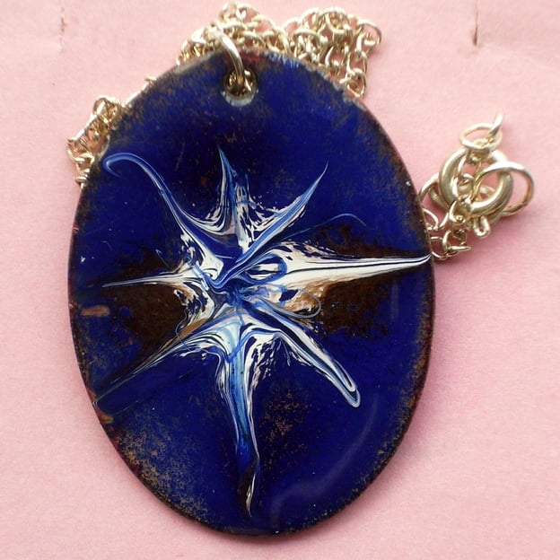 White and red-brown enamel scattered on the blue coat then scrolled create the unique, random scrolled pattern of this pendant. The copper base shines through in places in golden- brown tones