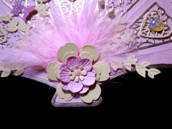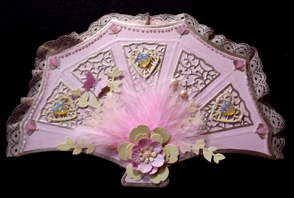 On three of the segments I have placed a die cut ivory coloured heart with a fancy heart gem on top, I have added a layered flower on top of leaves and feathers with two ivory pearls to one side and a glittery butterfly to the other. Around the edges I have placed a row of pink seed beads, and finished the card with gems, ribbon and coffee coloured lace.It is approx 22cm/8.5" at the widest point x 15cm/6" tall.