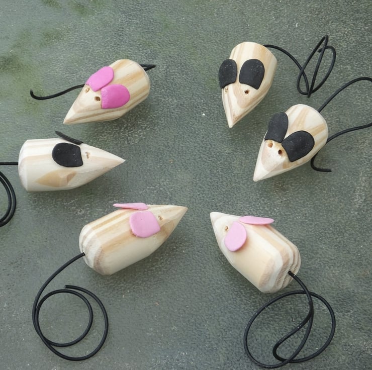 Six little wooden mice decorations each mouse has felt ears & long black tail