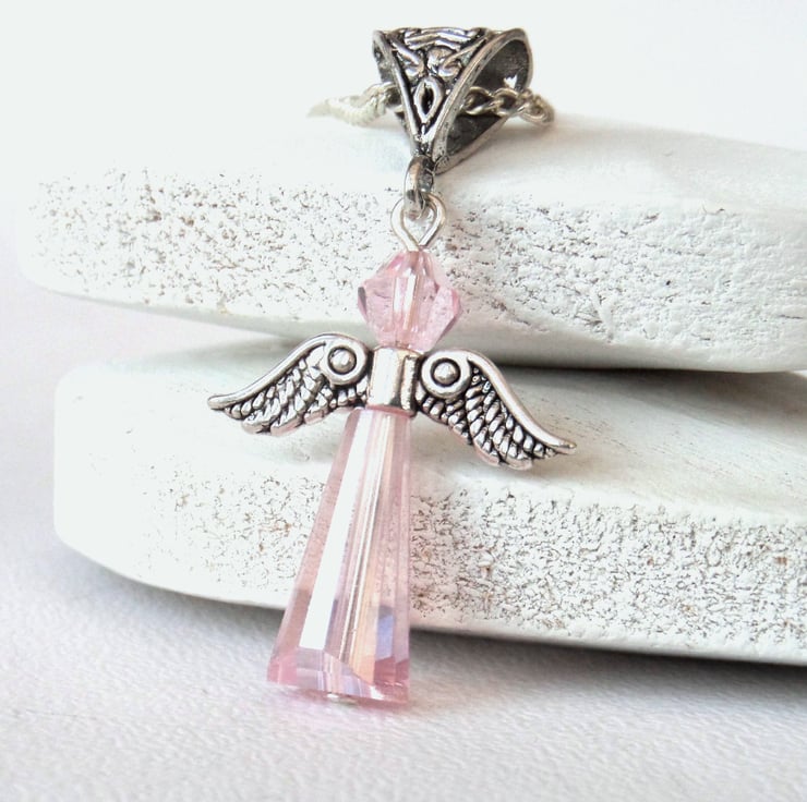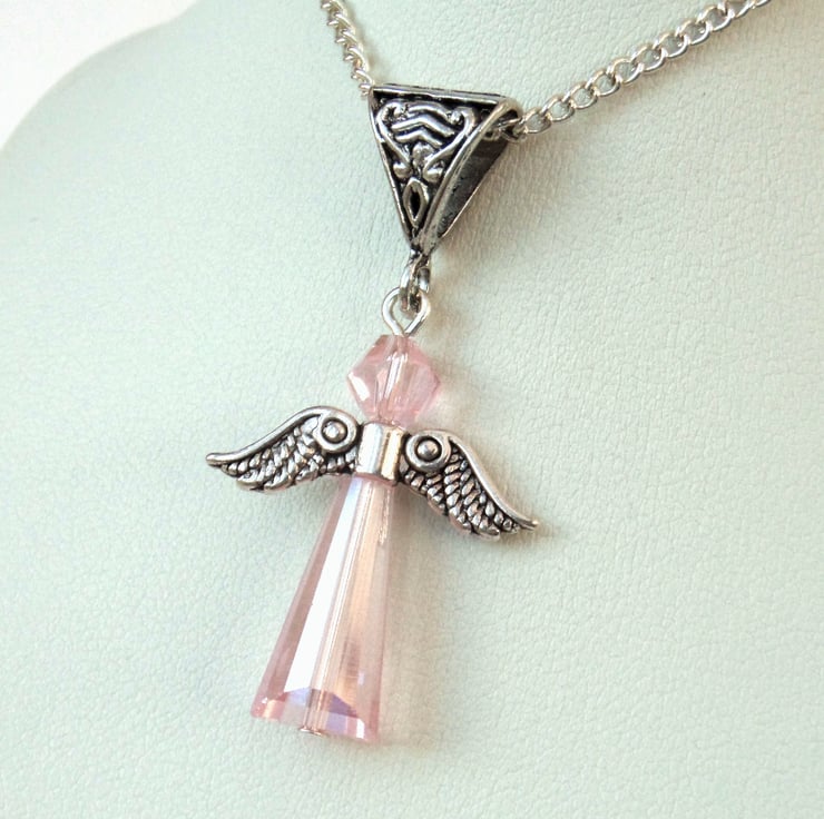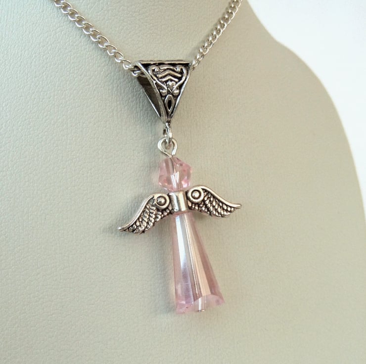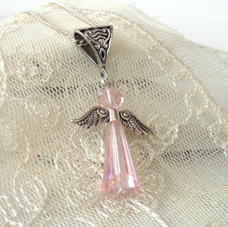 An adorable guardian angel necklace, made from two pink crystals and tibetan silver 'wings'.