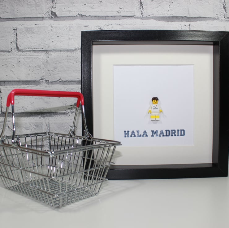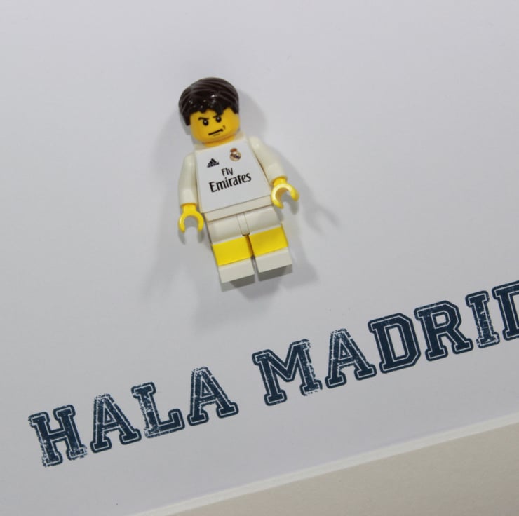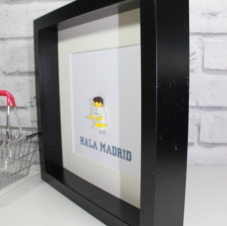 Our latest offering comes in the form of our tribute one of the most successful Spanish football teams - Real Madrid. Many people have asked about this and we have now finally delivered! We have created a custom minifigure using original Lego parts. Our little fella is wearing the latest strip that has been recreated using a customised sticker front on his torso. He has been mounted in to a deep box frame and we have printed "Hala Madrid" underneath.