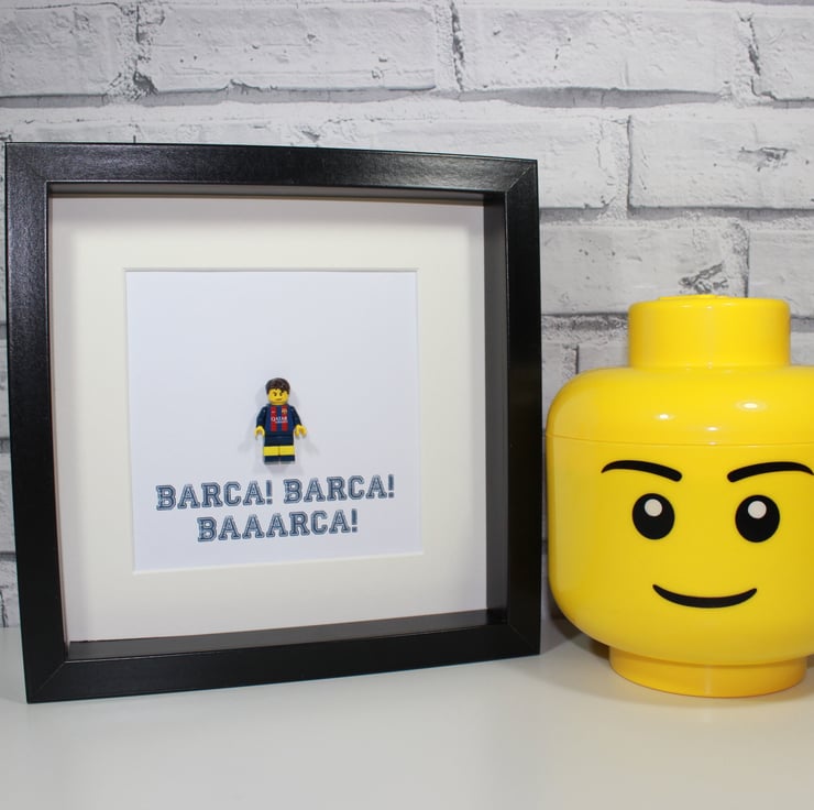 Our latest offering comes in the form of our tribute one of the most successful Spanish football teams and one of the most recognised teams worldwide - Barcelona. Many people have asked about this and we have now finally delivered! We have created a custom minifigure using original Lego parts. Our little fella is wearing the latest strip that has been recreated using a customised sticker front on his torso. He has been mounted in to a deep box frame and we have printed "Barca! Barca! Baaarca" underneath.