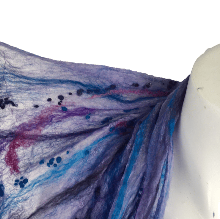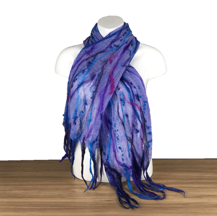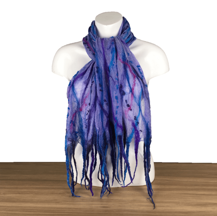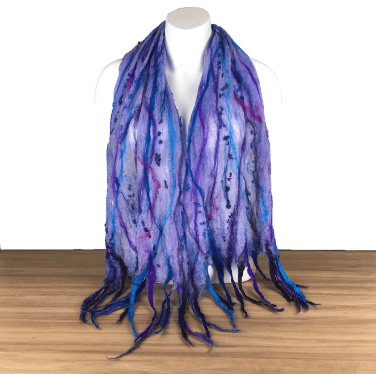 Incredibly fine and delicate, this scarf has been nuno felted on both sides using a blend of blue and purple merino wool and bleached tussah silk on a pale purple silk chiffon base fabric. The woollen layer is incredibly fine maintaining the sheer nature of the silk. Slightly thicker strands of merino wool in blue and purple shades have been added to one surface along with a scattering of tiny woollen balls. The scarf has been finished with tassels at both ends.