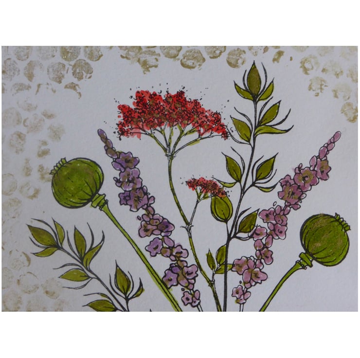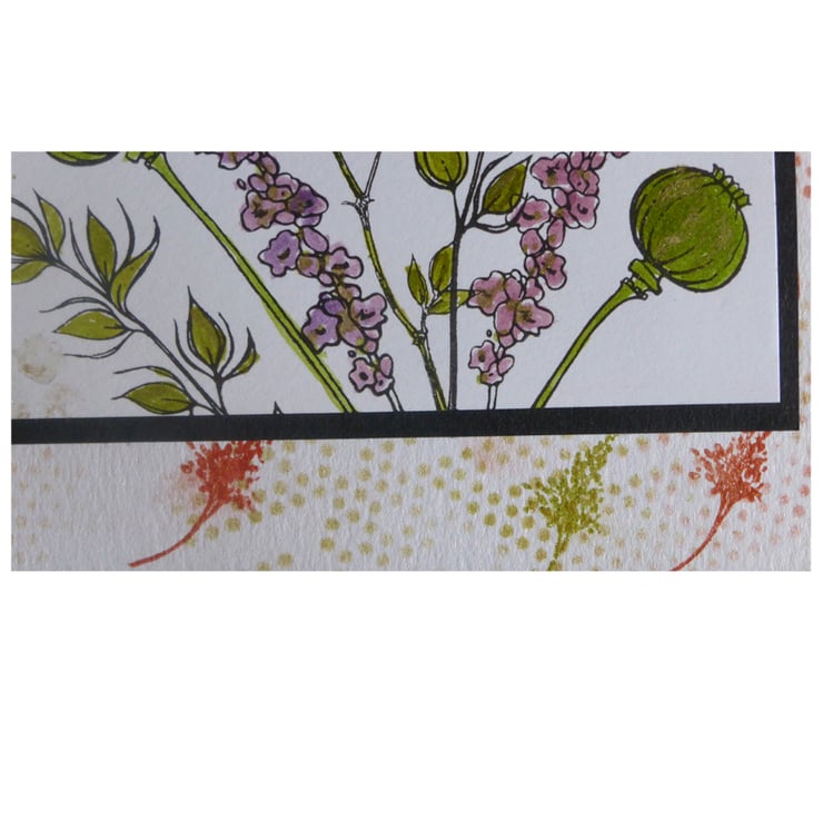 Lovely elegant card depicting stamped image of wild flowers which has been watercoloured. The flowers have been highlighted with starlights to add glitter. The background has been stamped with glitter paint to add texture. The image is mounted on black card.