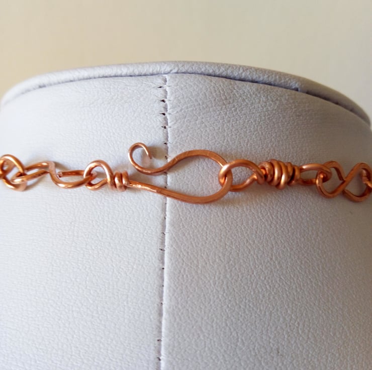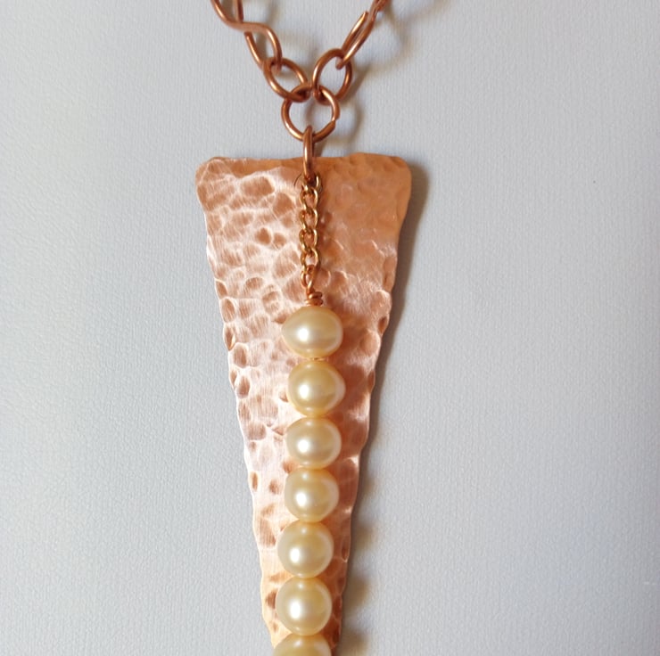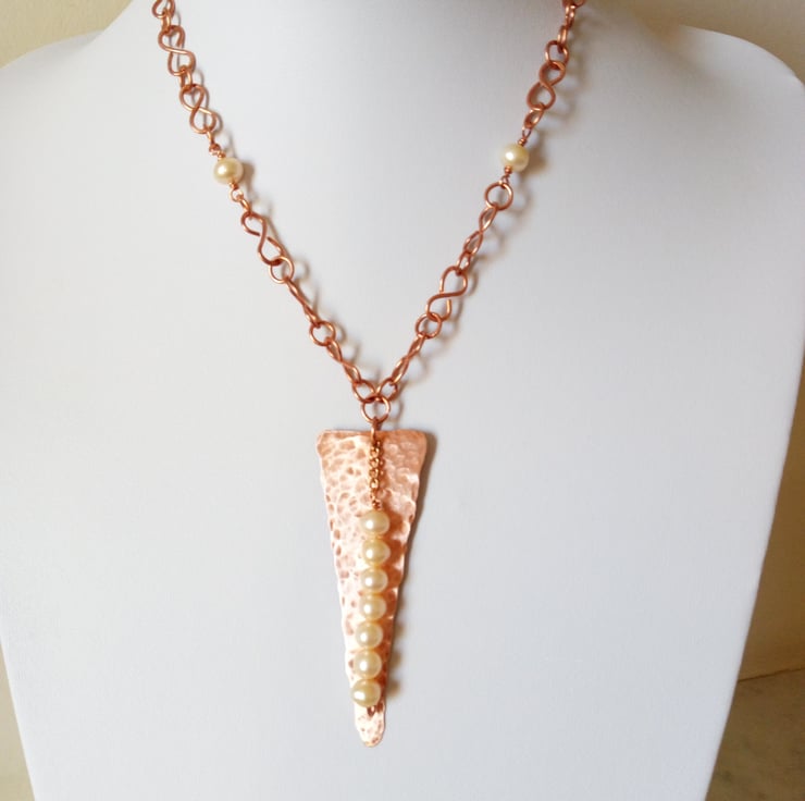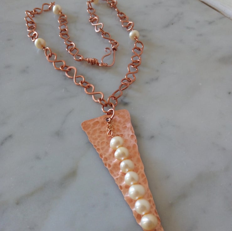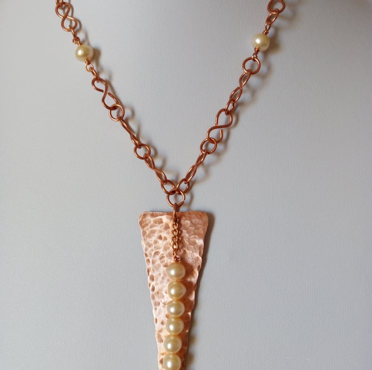 The necklace is made with genuine copper that has been cut, filed. and hammered.