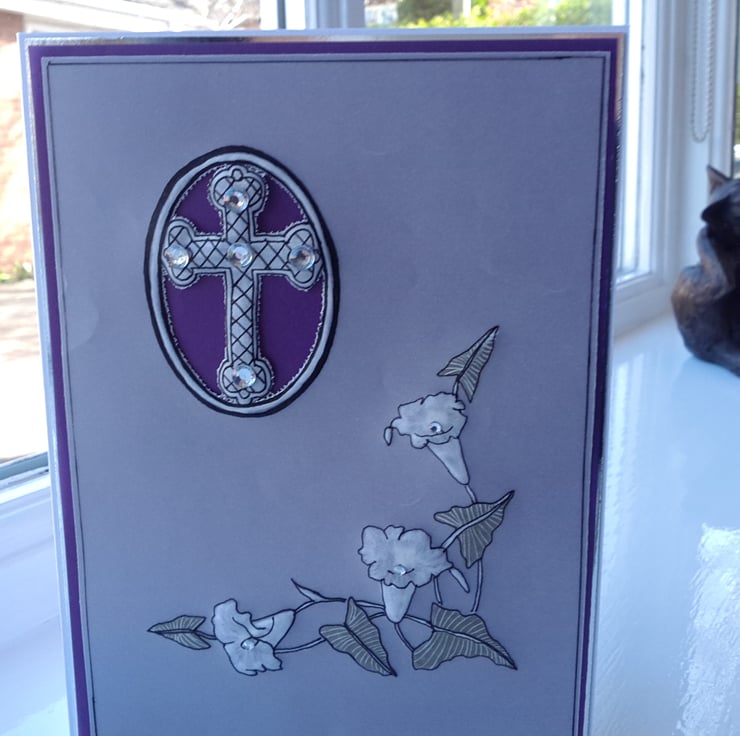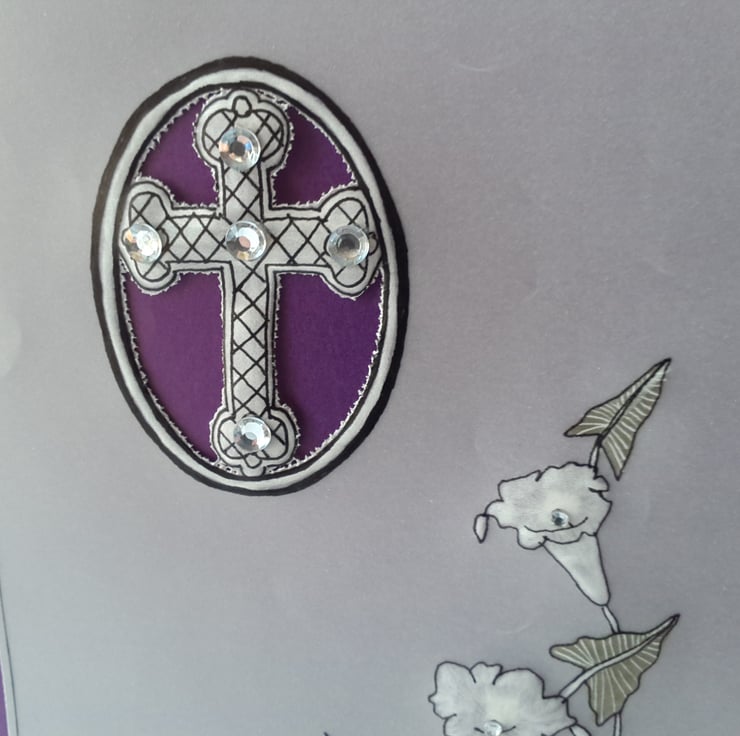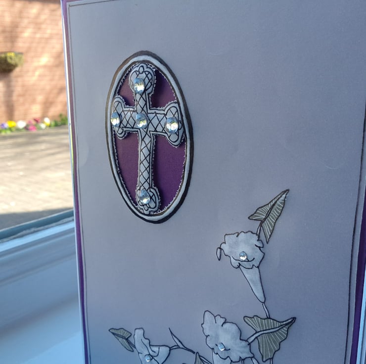 A completely handmade and uniquely designed card. Consisting of parchment which has been embossed, cut and pierced with an oval containing a cross. Decorated with a spray of white lollies.. mounted onto purple vellum, silver mirri card and then onto quality pristine white card. Finished off with crystal rhinestones on the cross and the centre of the lollies.