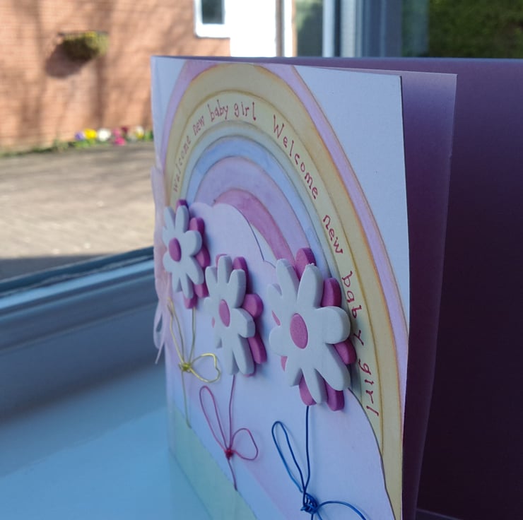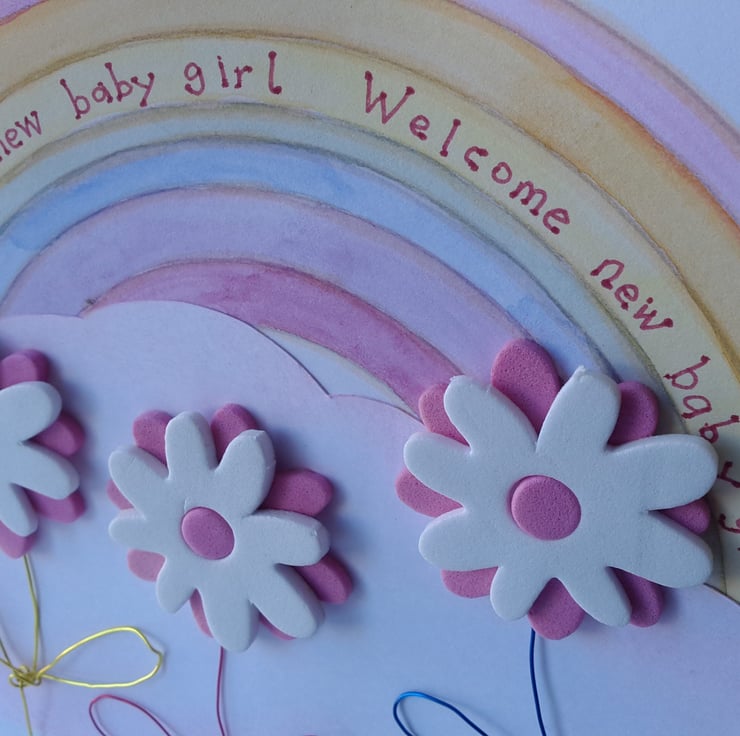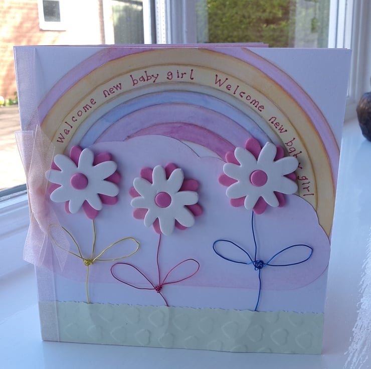 A completely handmade and uniquely designed card. Consisting of a row of 3 flowers made from funky foam, with wire stem and leaves. Mounted onto quality pristine white card which has a beautiful rainbow hand water colour painted. A strip of green heart embossed card runs along the bottom. Finished off with a pale pink organza ribbon and bow.