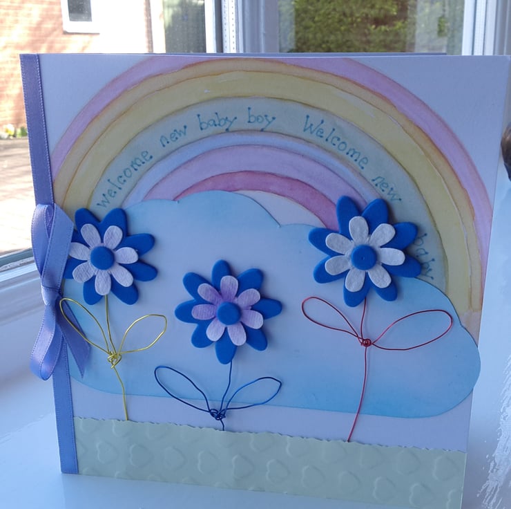 A completely handmade and uniquely designed card. Consisting of a row of 3 flowers made from funky foam, with wire stem and leaves. Mounted onto quality pristine white card which has a rainbow hand drawn and hand painted in water colour. A strip of pale green heart embossed card along the bottom. Finished off with a lavender blue ribbon and bow