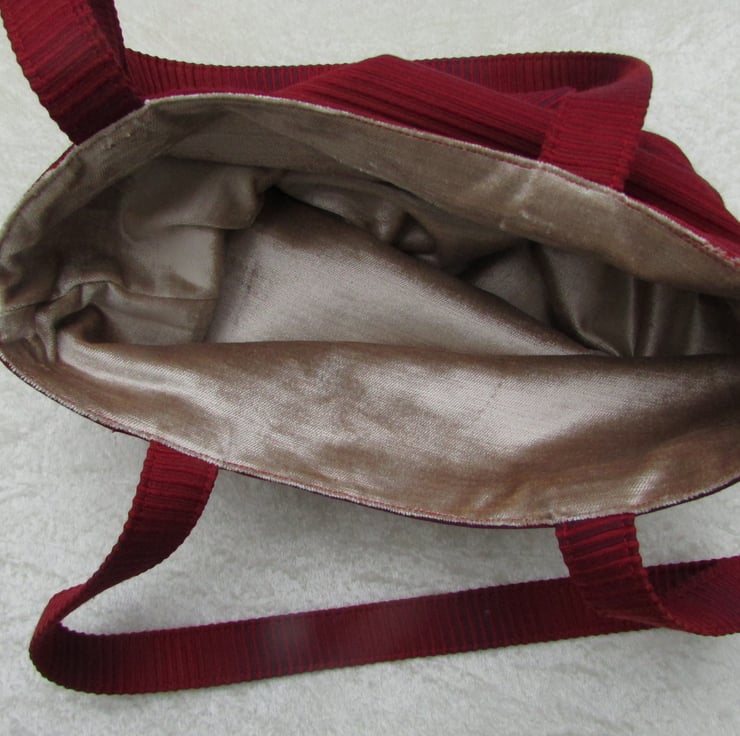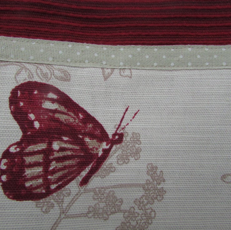 A tote bag in a textured red fabric with a front decorative panel. The panel features a pretty print pattern of red butterflies and beige flowers on a cream background. The top and bottom edges of the panel are finished with cotton twill ribbon in beige with white polka dots. The bag is fully lined with a gold-coloured velvet-finish fabric.