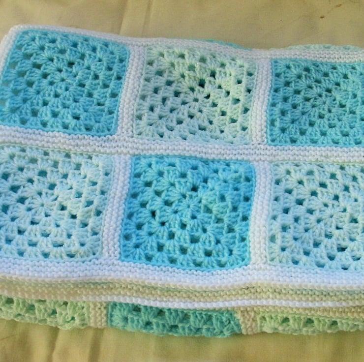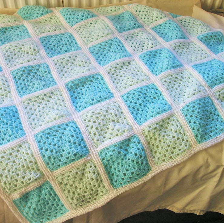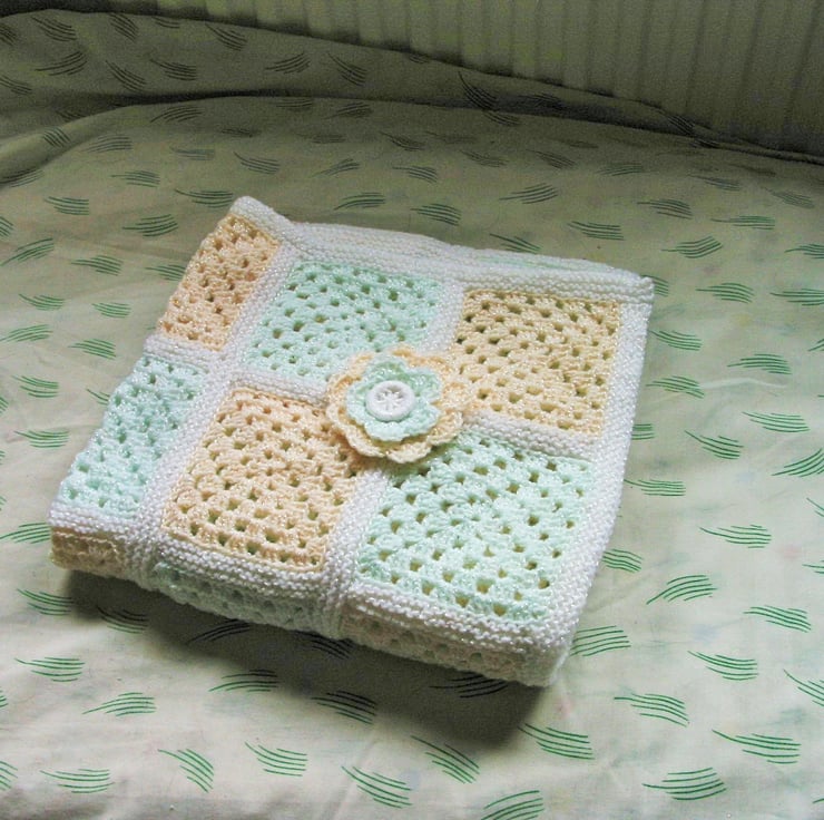 Crocheted Granny square cot blanket pattern, with unique knitted joins. Photo tutorial included.
