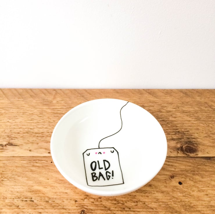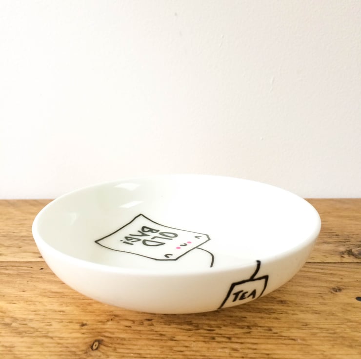 A Round ceramic dish painted with an old tea bag design using porcelain paints, the design is dried and baked to seal so that it is ready for use in your kitchen.