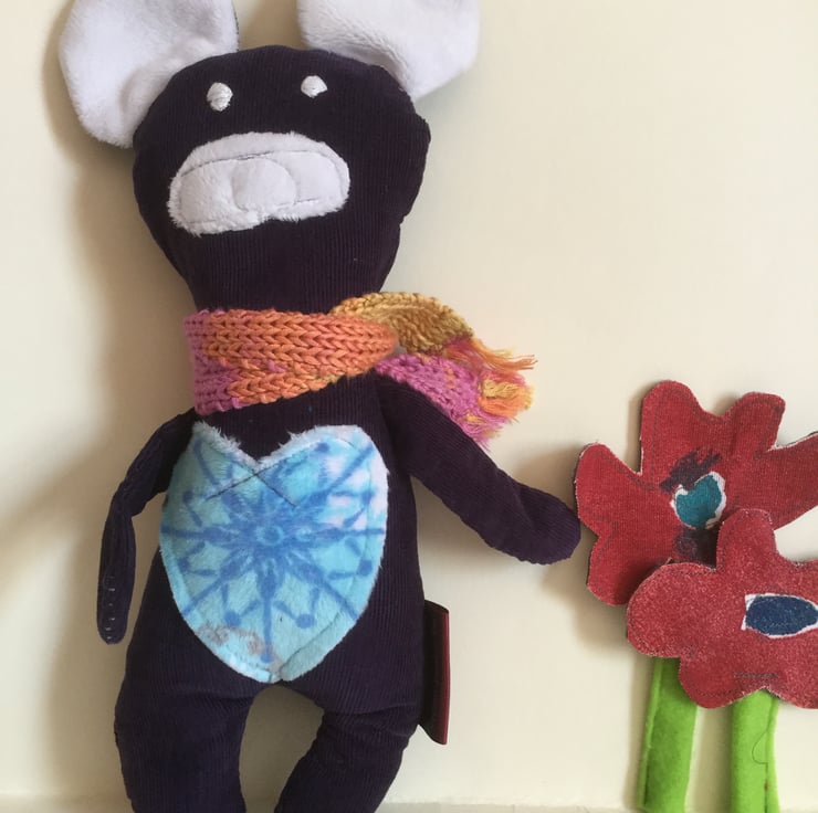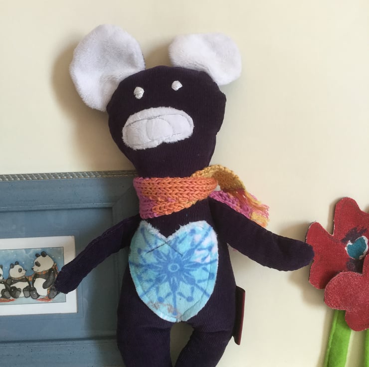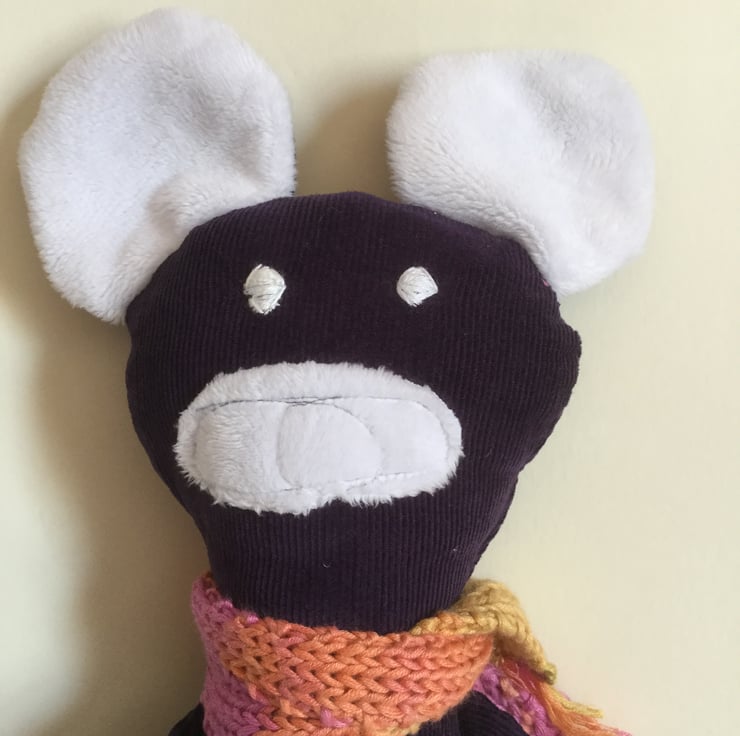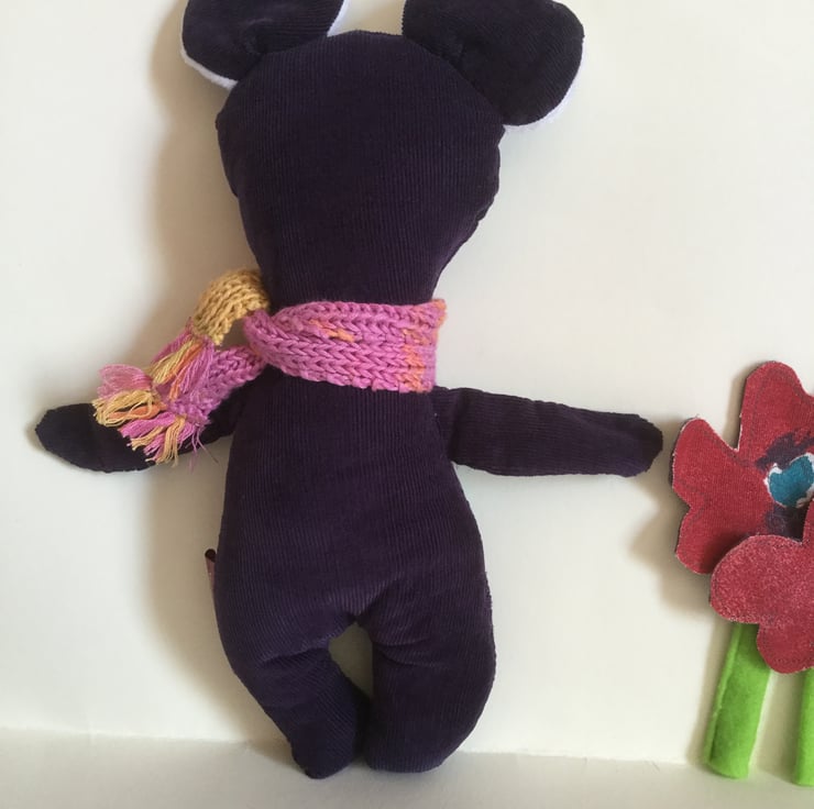 A super soft purple baby Corduroy with white embroidered plush nose, white plush ears backed with purple Corduroy and a SnowFlake plush heart on the tummy. White embroidered eyes and a knitted scarf around his neck.