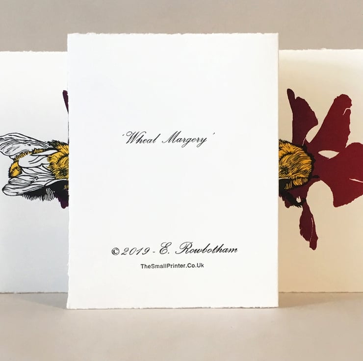 This little Ginger Carder Bee perches skilfully on a wild balsam blossom with its head buried determinedly collecting pollen. I've coloured the flower with a blend of plum purple to reddish purple giving it depth. I achieve this during hand inking the flower lino block. The bee is also hand inked, in a seville black. I've hand printed this 3 times, on my ancient Albion Press, to achieve the final image on artist paper which I then fold to form a card.