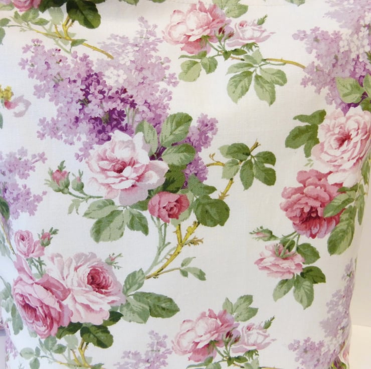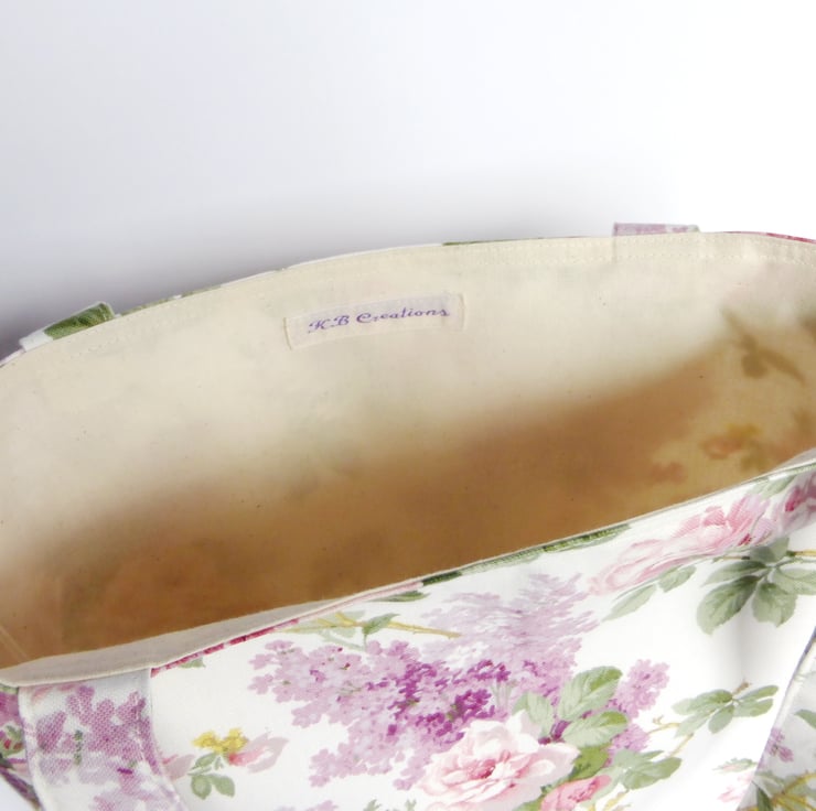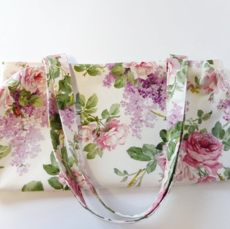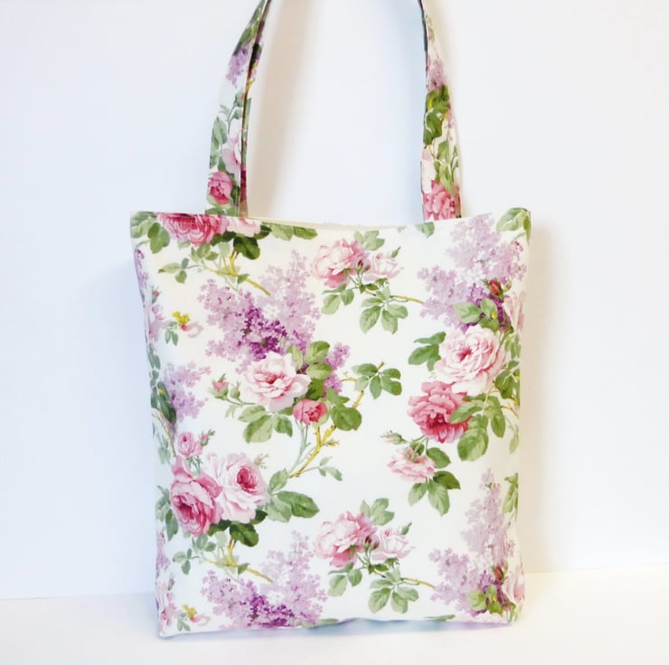This is a lovely everyday floral medium sized tote bag/shopping bag made with a furnishing weight fabric in a pretty floral design in shades of pink and lilac on a white background. The lining is a medium weight calico.