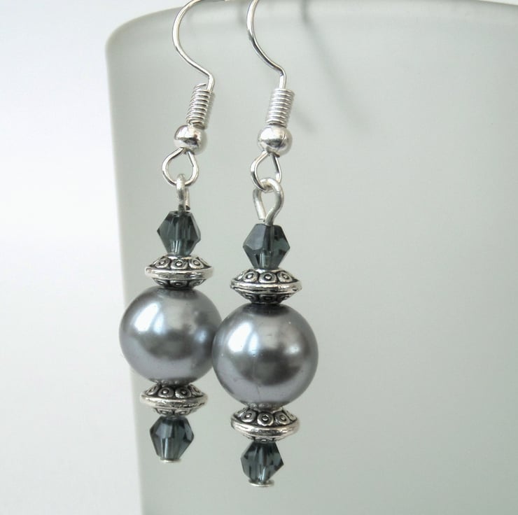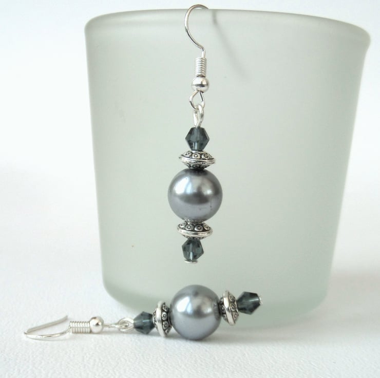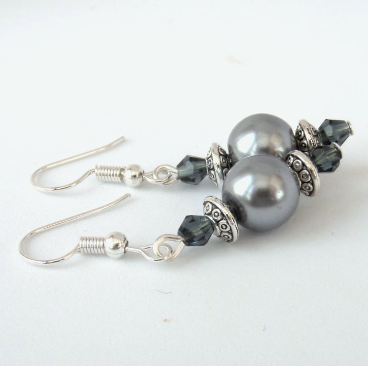 A pair of handmade earrings, with a great combination of silver shell pearl, blue crystal and tibetan silver beads that hang from silver plated wires.