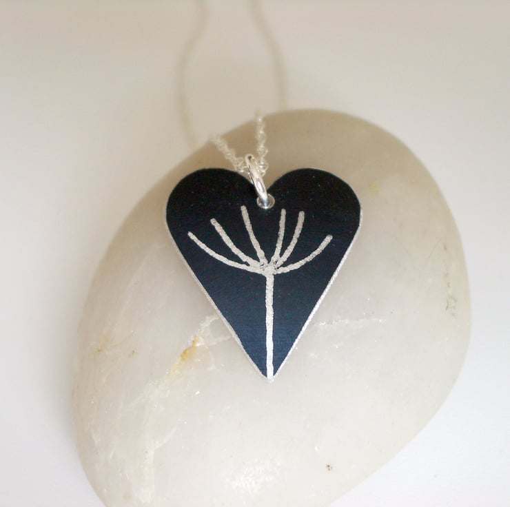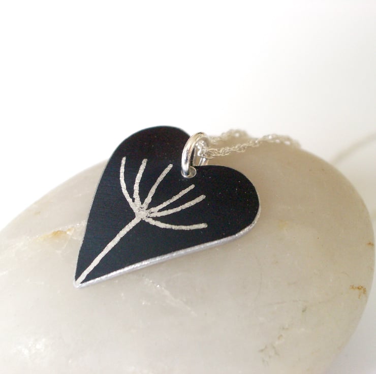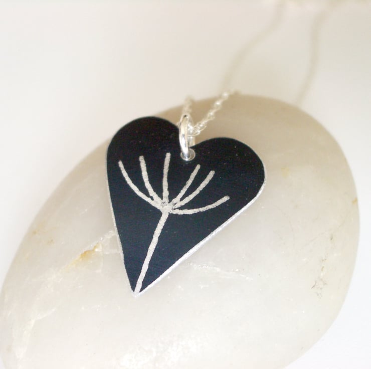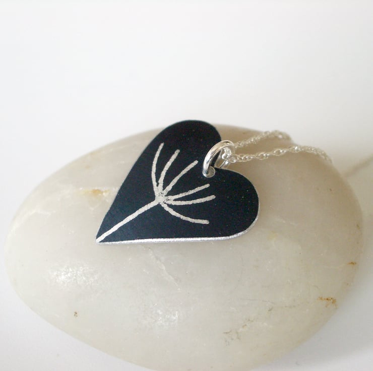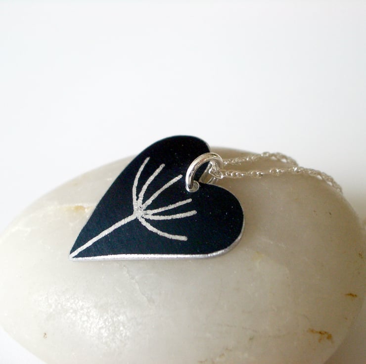 This black heart pendant is hand crafted from aluminium, which I have dyed black and printed with a silver dandelion seed motif. The dye is made permanent through heat. I then saw pierce by hand the heart shape and dome it so that it catches the light.