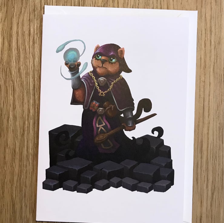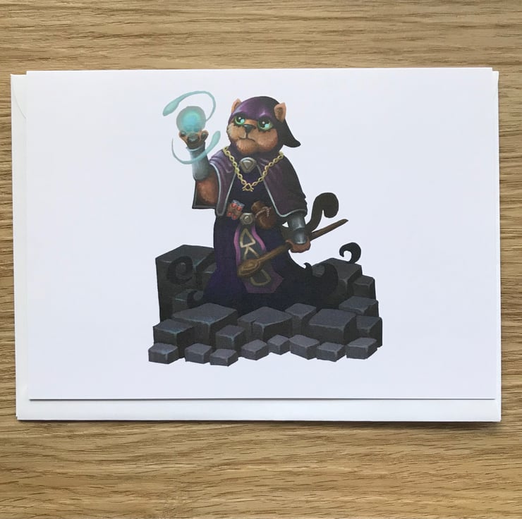 A fantastical 'Cat Sorceress' blank greeting card with white envelope by DuffleCat Prints (Damian Case)