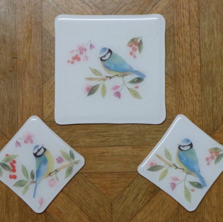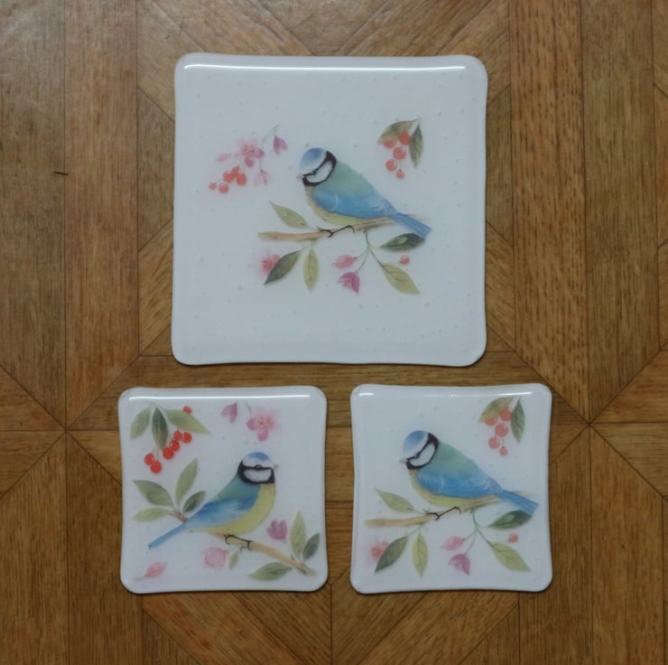 This coaster and trivet set has a beautiful blue tit design on white glass. It has been fully annealed to make it strong and is suitable for use with hot tea or coffee cups but not pans straight from the oven. It would make a great gift, secret santa or stocking filler.