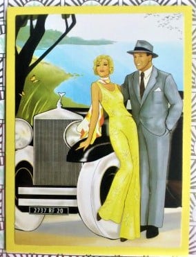The card consists of layers card with green, black and white art deco style paper bordered with yellow paper. I have added an image of a couple in 1920's clothing leaning against a vintage car with a sea view behind them. This image is also bordered in yellow with the yellow matching the ladies clothing. I have finished the card with panel of yellow embossed paper and a "Happy Birthday" sentiment to the bottom.